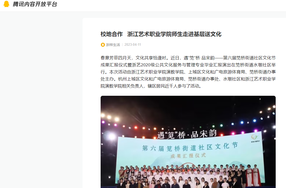 “人民在哪里,哪里就是中心;生活在哪里,哪里就是舞台。”本次笕桥街道社区文化节历时两个多月,2020级公共文化服务与管理专业80名同学在专业老师带领下,通过实地走访基层、深挖笕桥故事、回应需求呼声等方式,深入一线为群众开启文化点单定制服务。他们打造的社区文化节以笕桥特有的架空层文化空间为宋韵文化主要展示场景,分成“表演、歌舞、视觉”三个模块,开展培训比赛、手工体验、非遗研学等公益文化活动20余场次,惠及居民3000余人。真正实现社区文艺爱好者动起来、文化空间亮起来、文化活动火起来,将精神共富深植基层沃土,为基层群众打造文化满园花香。
