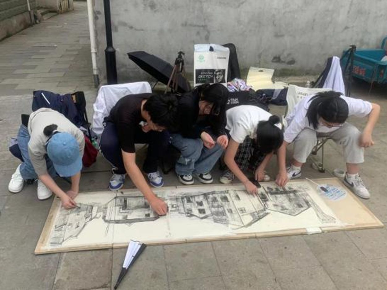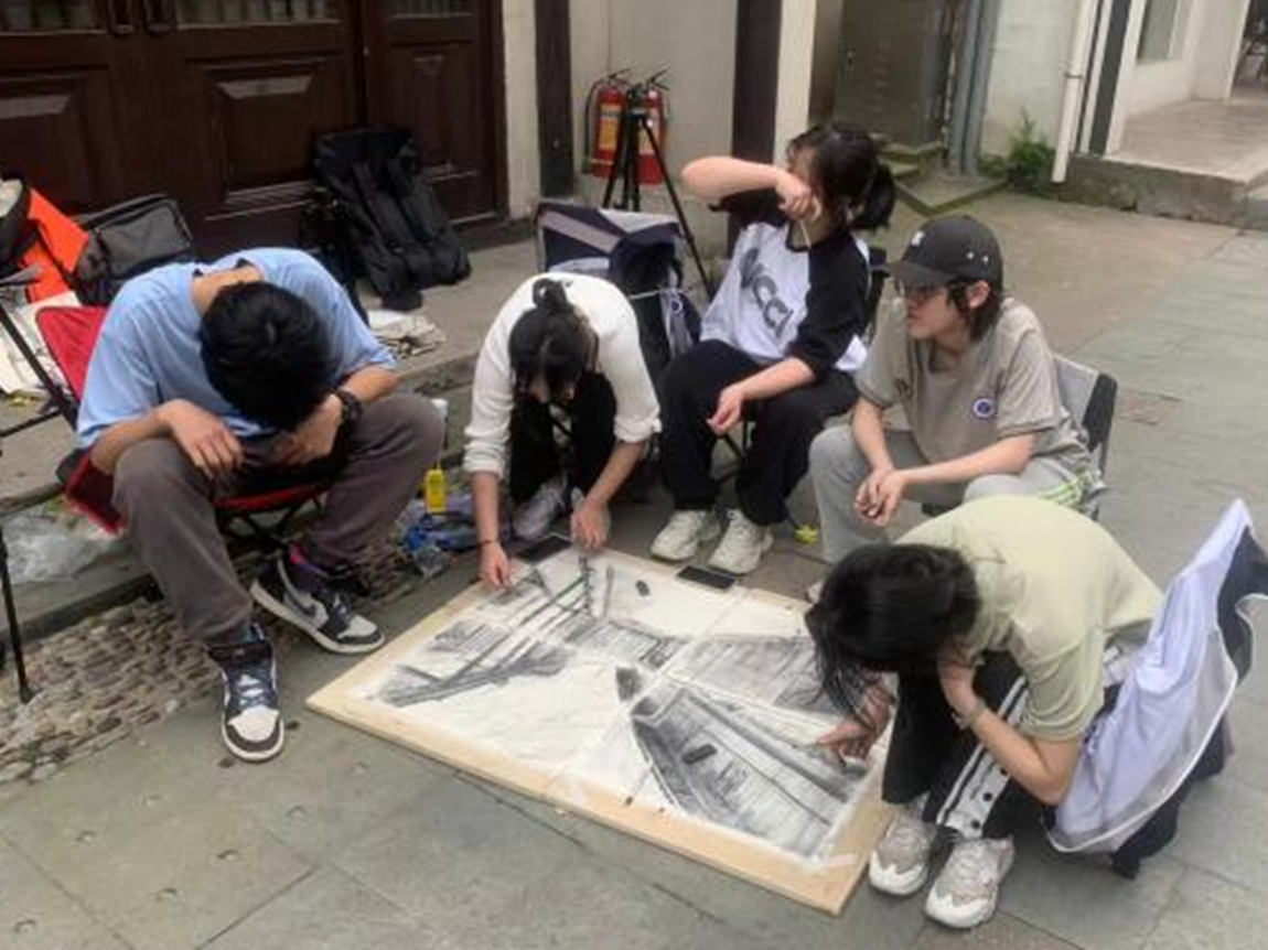 写生采风期间,同学们严格遵守纪律,及时完成绘画作品。专业教师认真指导学生,为同学们作示范画,并进行集中点评,互相交流分析。通过“讲练评改”的方式使得同学们的技能有了进一步提升,为后续专业课程学习夯实基础。
