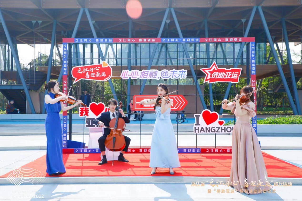 音乐学院学生演绎器乐四重奏《我和我的祖国》《我爱你中国》,为参加毅行活动的侨界代表和毅行爱好者加油鼓劲,用音乐的形式参与亚运、迎接亚运,助力亚运。