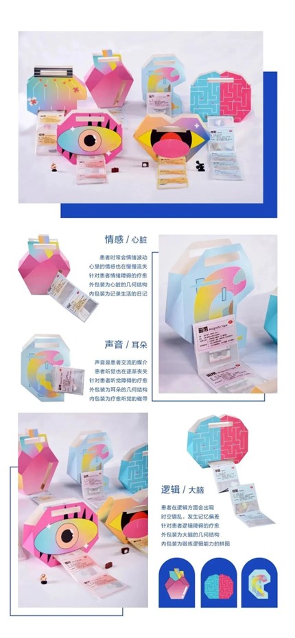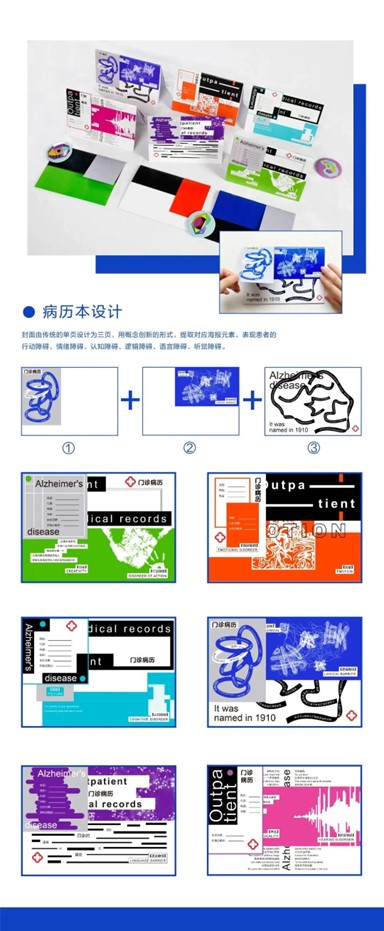 设计说明:阿尔兹海默症,是一种起病隐匿的、进行性、长期发展且不可逆的病理性神经失调症。近年来,患病者逐渐呈现年轻化趋势,一直以来它给大众传递的是沮丧、严肃的感受。本课题以艺术疗愈的角度来探究阿尔兹海默症,从普及相关专业知识和关爱阿尔兹海默症患者的初衷出发,立足于患者可能会出现功能障碍的六个方面:逻辑、创造、语言、声音、图画、情感,进行海报、创意包装及衍生品设计。作品以弥散、抽象的视觉风格,直观地呈现患病者的主观感受。希望以非药物心理疗愈、积极勇敢面对的方式,鼓励呼吁社会主动关注和理解阿兹海默症患者,给予该群体更多的关爱和一个良好的社会环境。