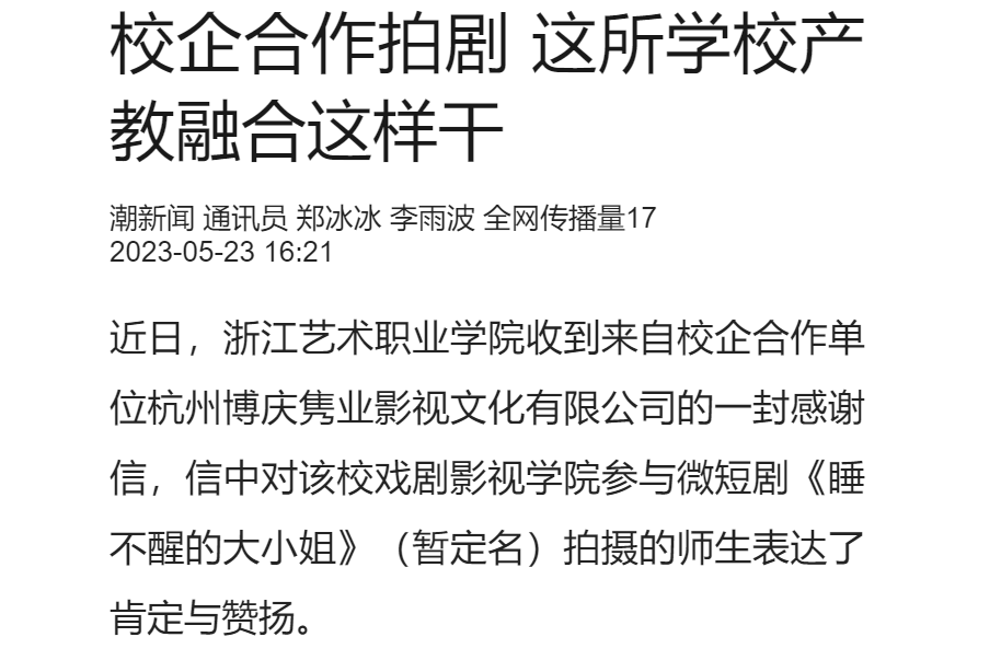 首部浙艺戏剧影视学院与杭州博庆隽业影视文化有限公司联合出品的微短剧《睡不醒的大小姐》,由杭州博庆隽业影视文化有限公司法人代表赵博担任导演,赵博、郑昀昕担任编剧,戏剧影视学院副院长(主持工作)那刚担任艺术总监、院长助理徐旭恒担任联合制片人、摄影摄像技术专任教师孙国虎担任摄影指导,戏剧影视表演专业蒋珊、忻宇杰、黄梓博等12位学生担任演员,摄影摄像专业吴庆红、林旭等6位学生担任摄影助理,影视制片与管理专业陈灵涛、张贺2位学生担任制片助理。