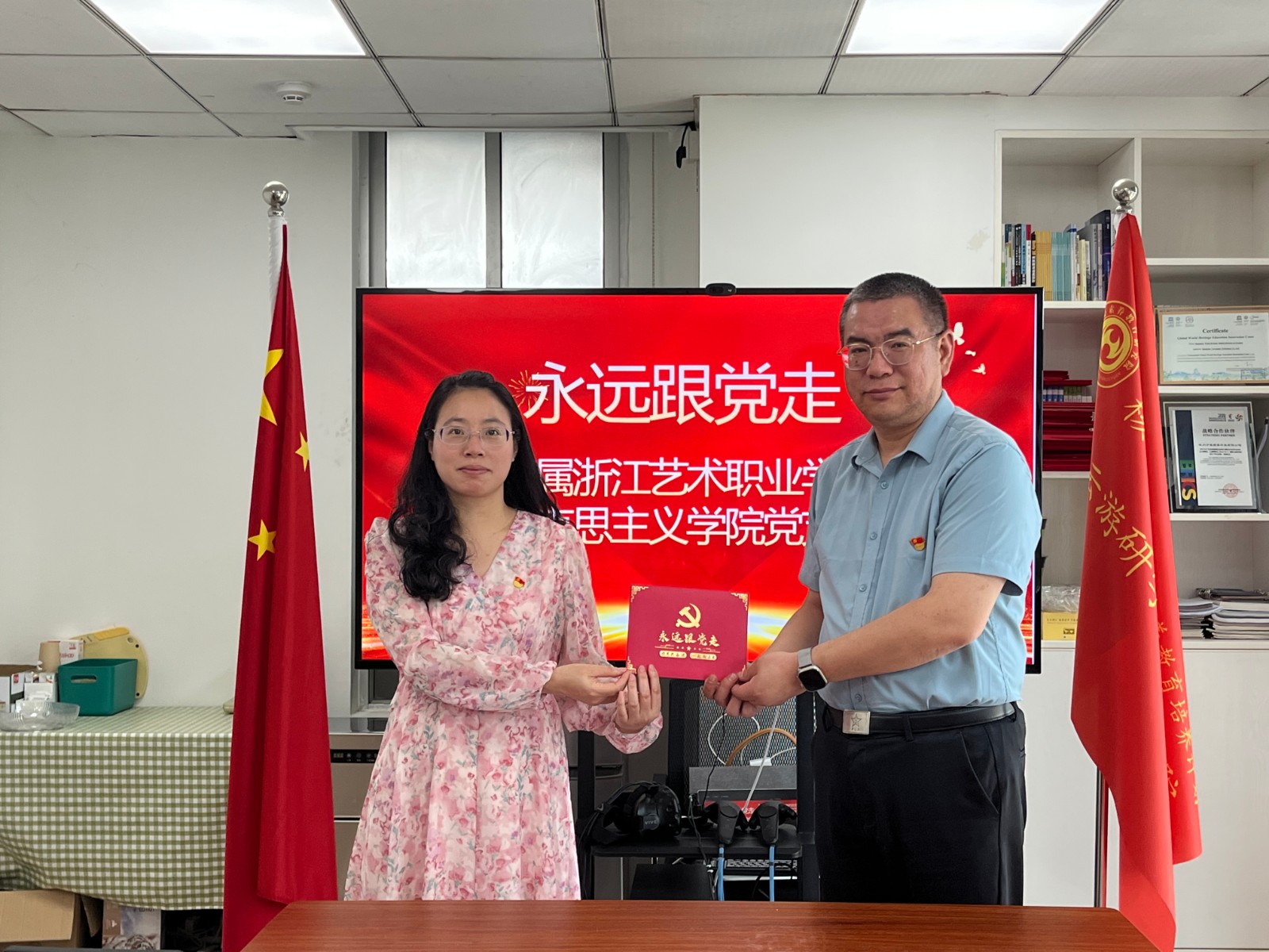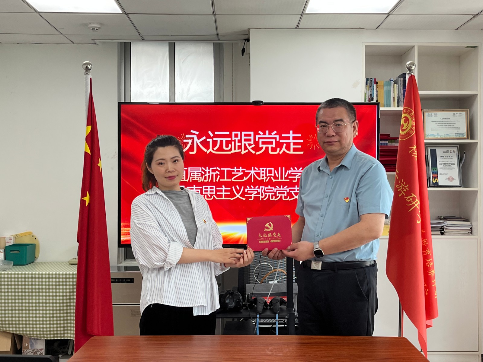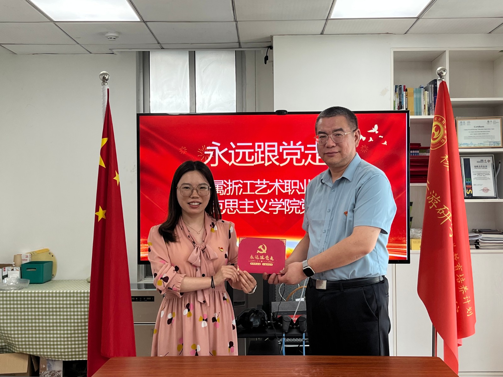交流活动结束后,支部为5月入党的4名党员集体过“政治生日”,直属马克思主义学院党支部书记、副院长陈毅代表支部为4名同志赠送了“政治生日”贺卡。