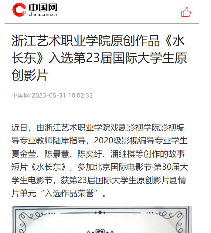 在水长东的制作过程中,获得了多方的支持和鼓励,才能有最后呈现在大屏幕上的最终成果。感谢岱山县政府,感谢浙艺,感谢老师,感谢同学,感谢社会各方的支持,帮助我们圆梦。希望电影梦如星星之火,以燎原之势头,卷过每一个籍籍无名的黑夜。