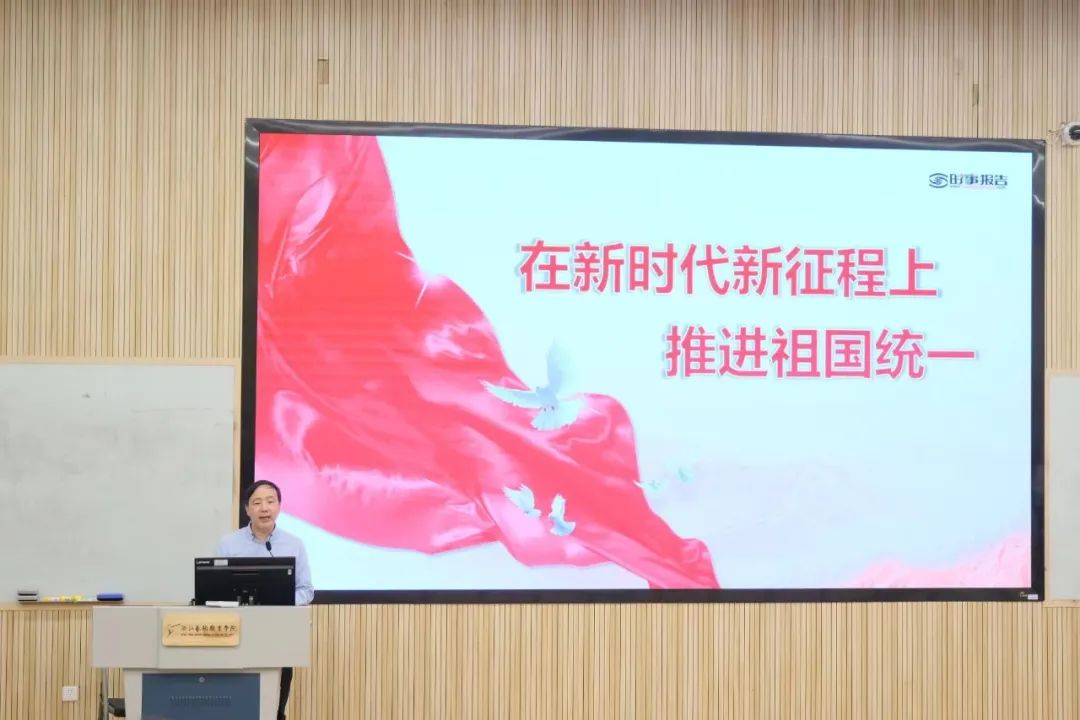 夏开堂以《在新时代新征程上推进祖国统一》为题从中共对祖国统一大业的光辉历程、祖国统一是不可阻挡的趋势、与时俱进的行动纲领等三个方面展开讲解。他详细讲解了在历史不同时期两岸统一的发展历程、阐述了祖国统一大业的必然趋势以及如今为完成祖国统一大业的实现路径。