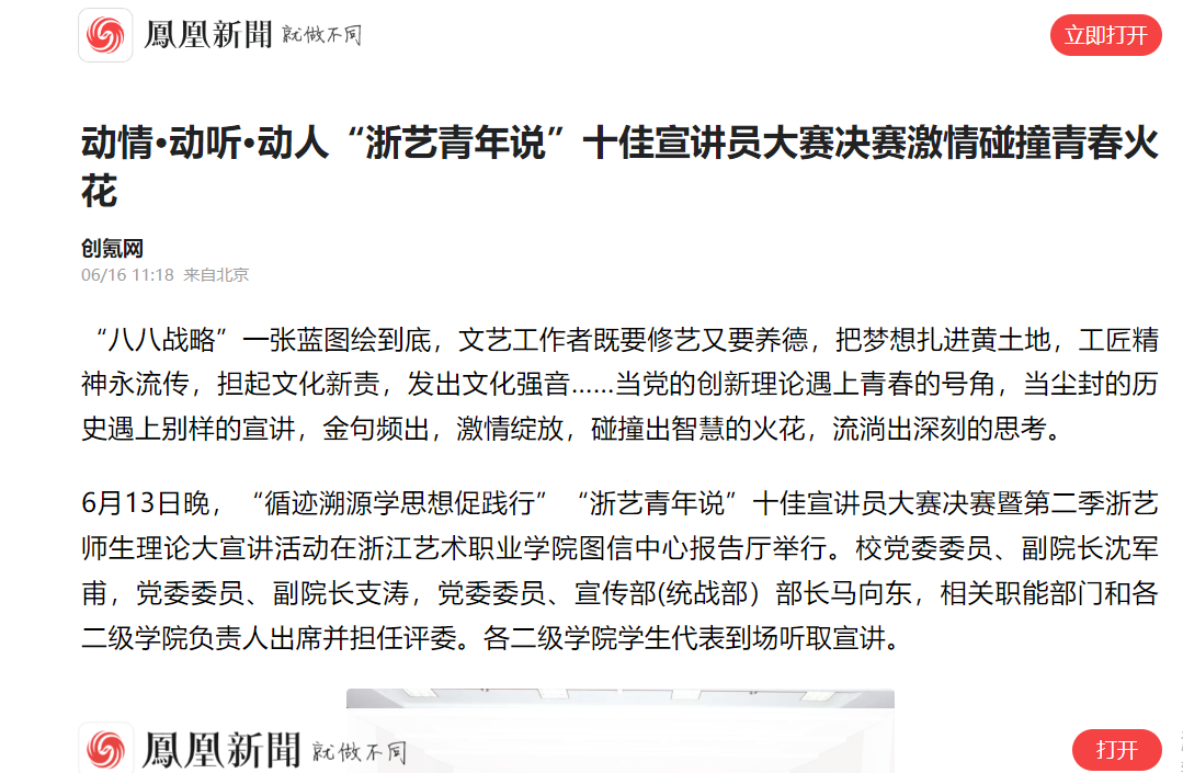 凤凰新闻:动情·动听·动人“浙艺青年说”十佳宣讲员大赛决赛激情碰撞青春火花