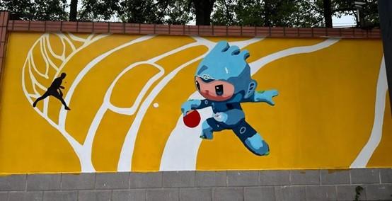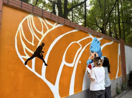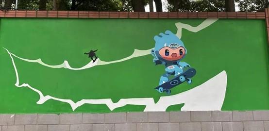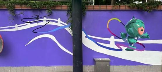 同学们将杭州亚运会吉祥物和杭州地标相结合,设计了墙绘草图方案,表现出独特的杭州韵味,展现了设计学子扎实的专业功底。