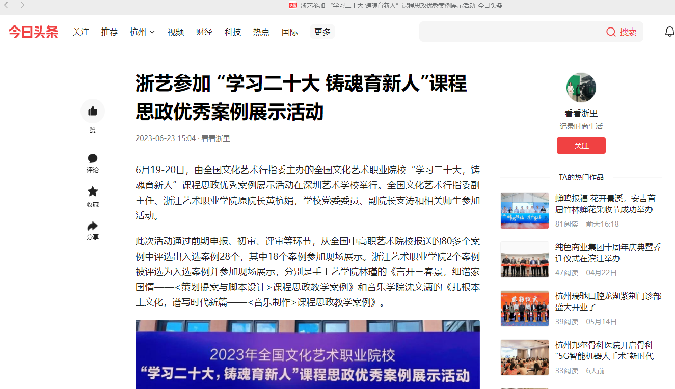 今日头条:浙艺参加 “学习二十大 铸魂育新人”课程思政优秀案例展示活动