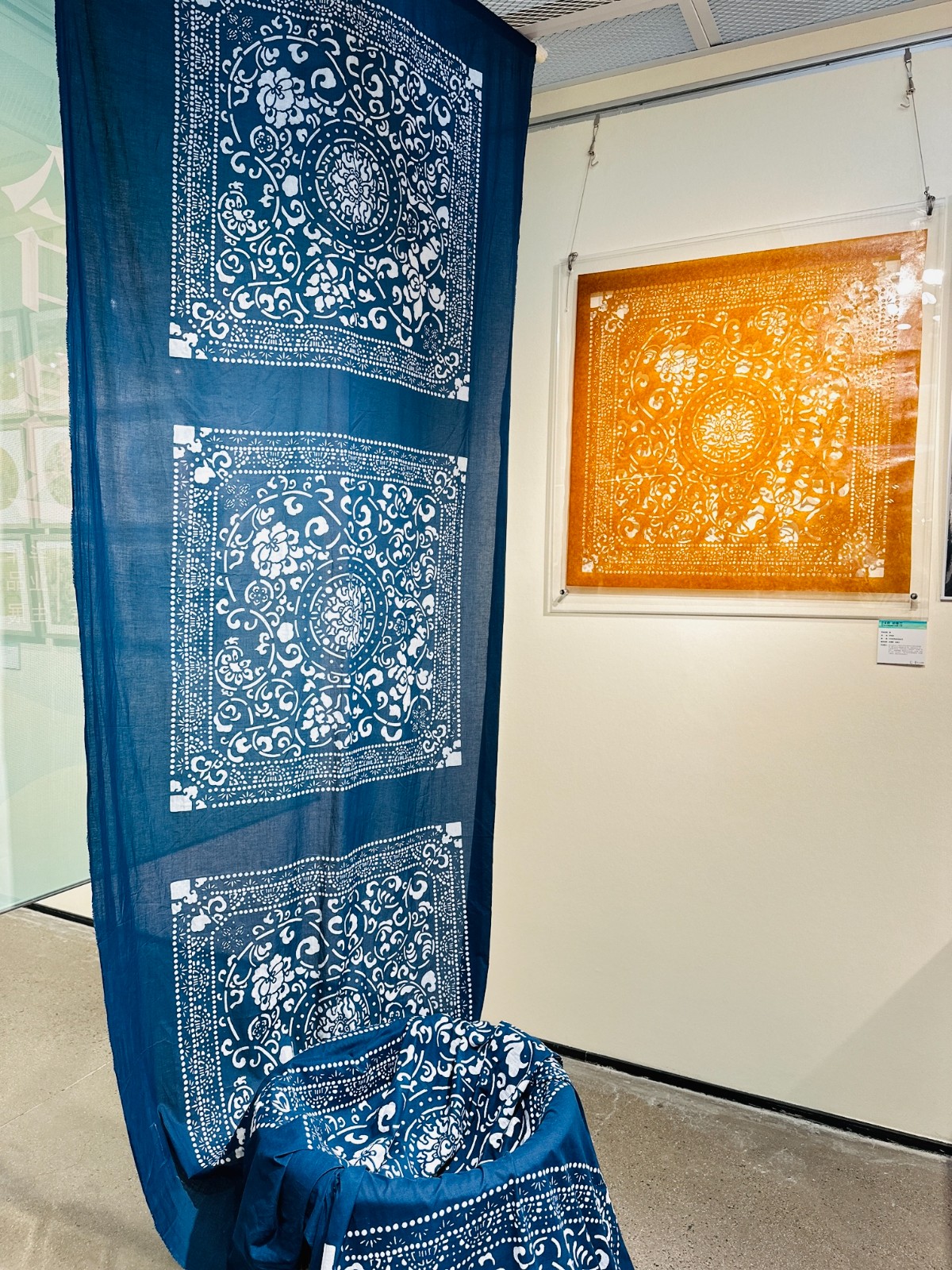 作品简介:创作灵感来自于传统蓝印花布纹样和宋代耀州窑瓷器花纹。耀州窑为北方青瓷的主要产地,宋朝时被列为贡品,并远销世界各地,在陶瓷发展史上影响深远。宋代的“药斑布”,其版模精细,调浆技术也有改进,宋代的“药斑布”往往“青白成文”,即后来蓝印花布的前身。将二者结合,创造出新的纹样样式。