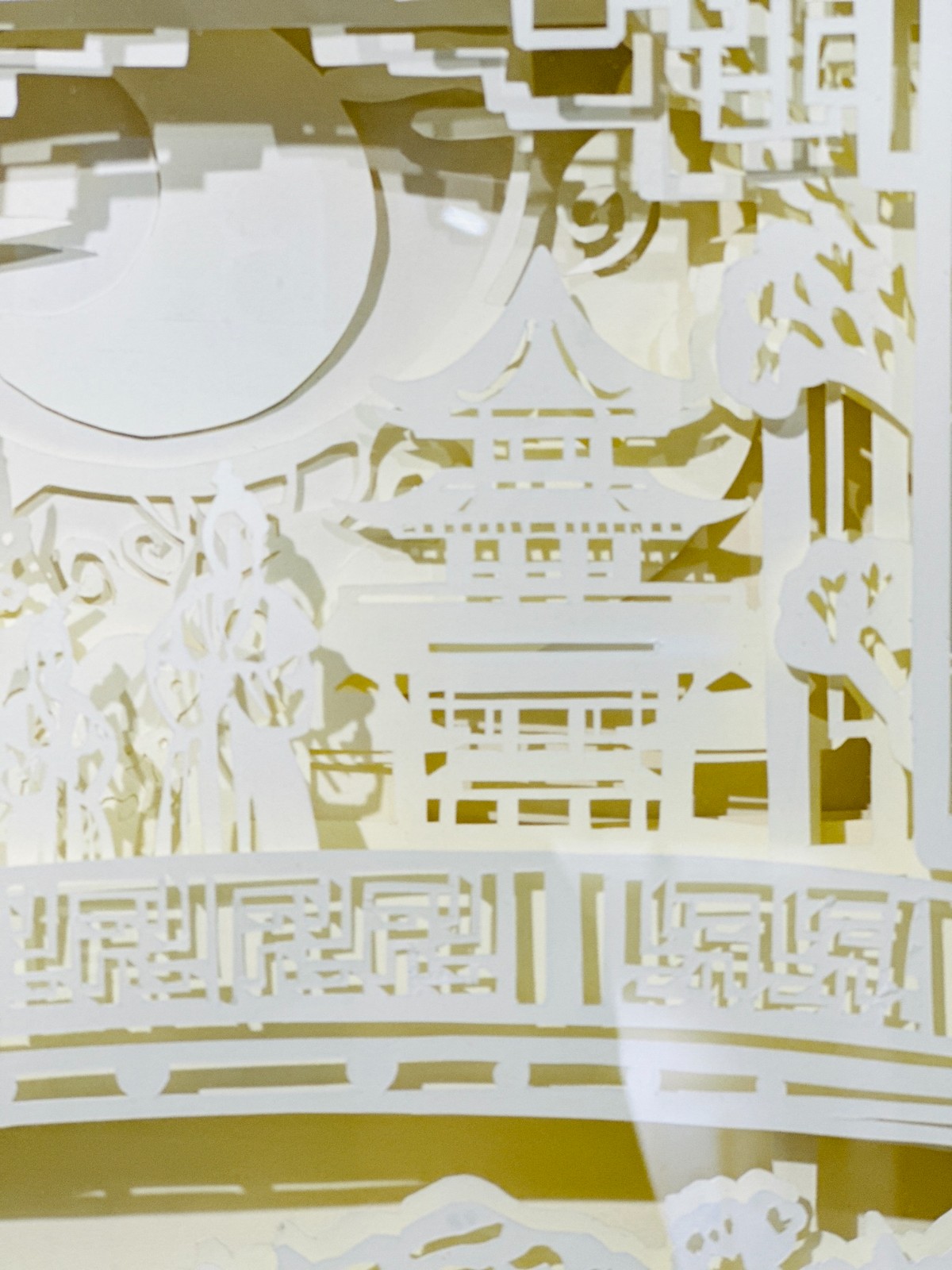 作品简介:《纸上谈宋》是采用纸雕工艺,将纸张层层叠放,搭配灯光,展现宋代民俗文化。纸雕灯是非遗文化和现代艺术的结合产物,结构丰富,种类多样。历史赋予了纸雕顽强的生命力,每一代人的生活,思想都浓缩在薄薄白纸中,纸雕展现出来的不只是手艺人的心灵手巧,更是泱泱大国上下千年的丰厚文化底蕴。我们试将宋代的故事,跃然纸上,在温暖灯光中,带你穿越古今,感受大宋人文。