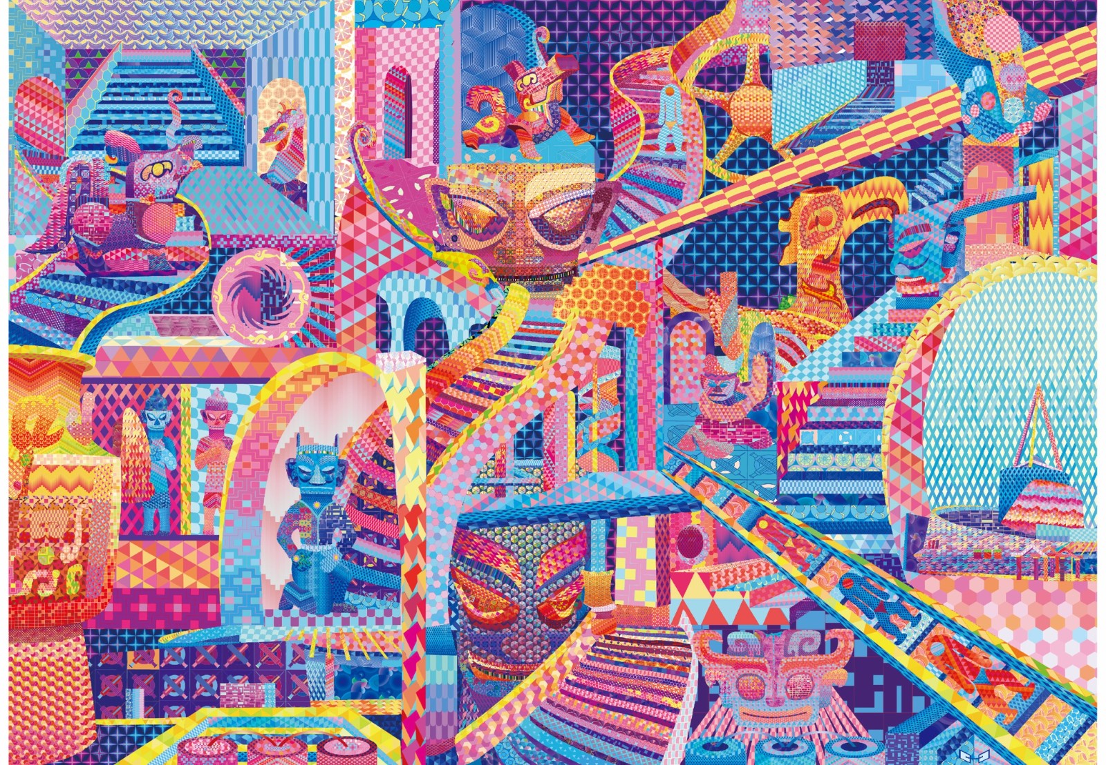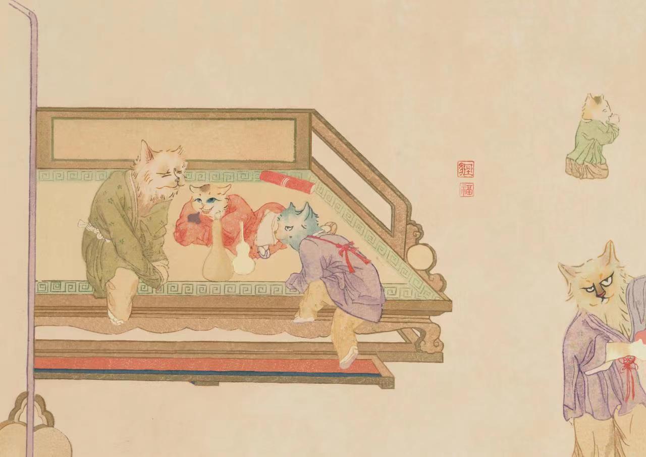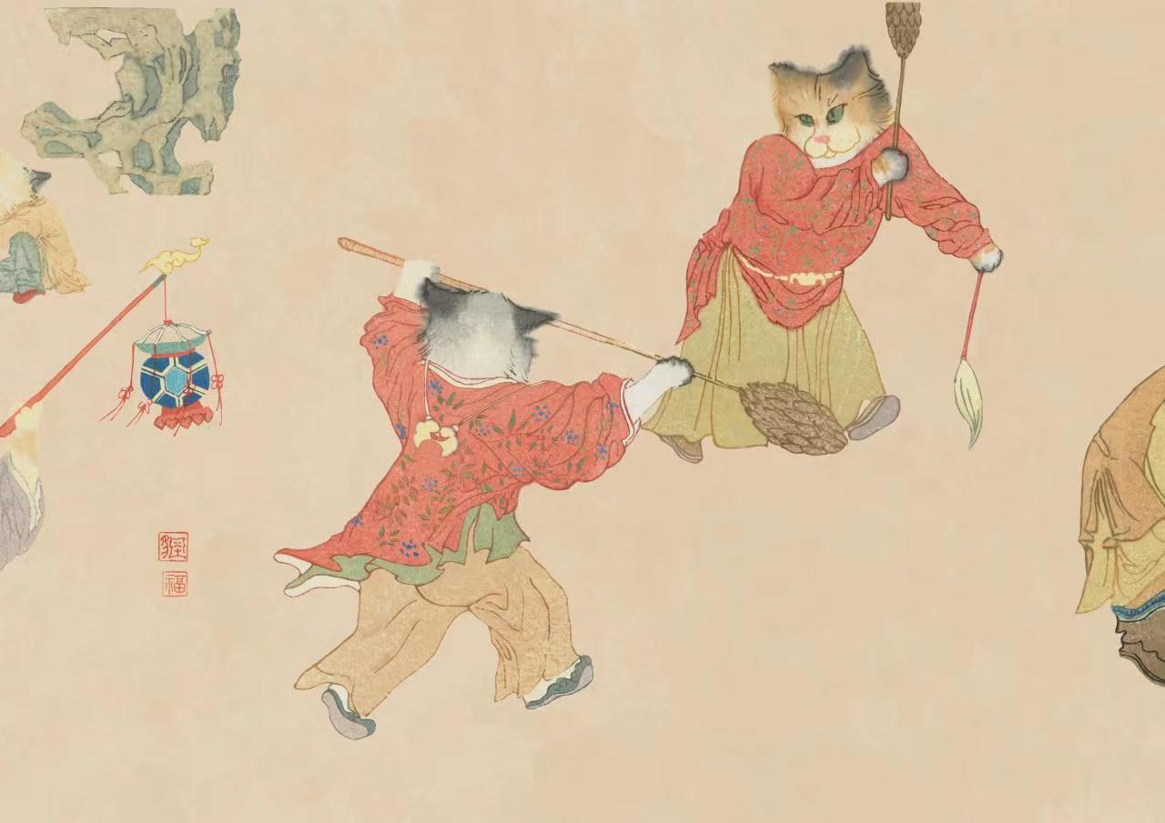 作品简介:创作灵感源于宋代绘画题材《婴戏图》,其中以苏汉臣所绘最盛。《历代名公画谱》称苏汉臣“制作极工,其写婴儿,着色鲜润,体度如生,熟玩之不啻相与言笑者,可谓神矣”。此作品结合了猫文化,基于人们对猫咪的喜爱,图中有许多猫咪拟人形象,模拟了宋代孩童嬉戏玩耍的情景。以版为载体、水为媒介,探索传统版画当代创新。