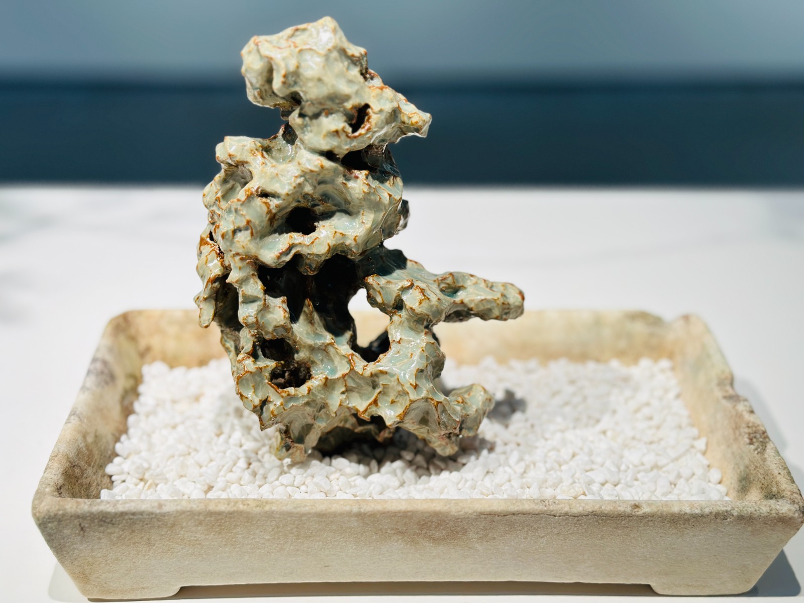 作品简介:“文人贡石”在中国文化中是自然的再现,它不仅指代寰宇林泉,更表现一种自由洒脱的生命状态。作者透过自然拙朴的状态,由物质的表面萃取其精神的本质,试图从中吸收美感精髓,并通过自己的艺术实践,遵从“道法自然”的古典哲理,解读中国古代文人的道德情操。作者运用浙江本土陶瓷材料,加以结构线条和虚实空间的对比塑造,既保留中国古典审美主义的婉约含蓄又吸收了西方抽象表现主义,亦实亦虚,在虚实之中展现中国古典大道。