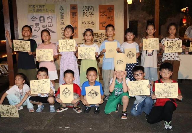 以刀为“笔”,木刻韶年。手工艺学院学生现场教学讲授绘、刻、印等一系列制作流程,带领游客们体验水印木刻的过程,让宣纸、木板和颜料奇妙融合。