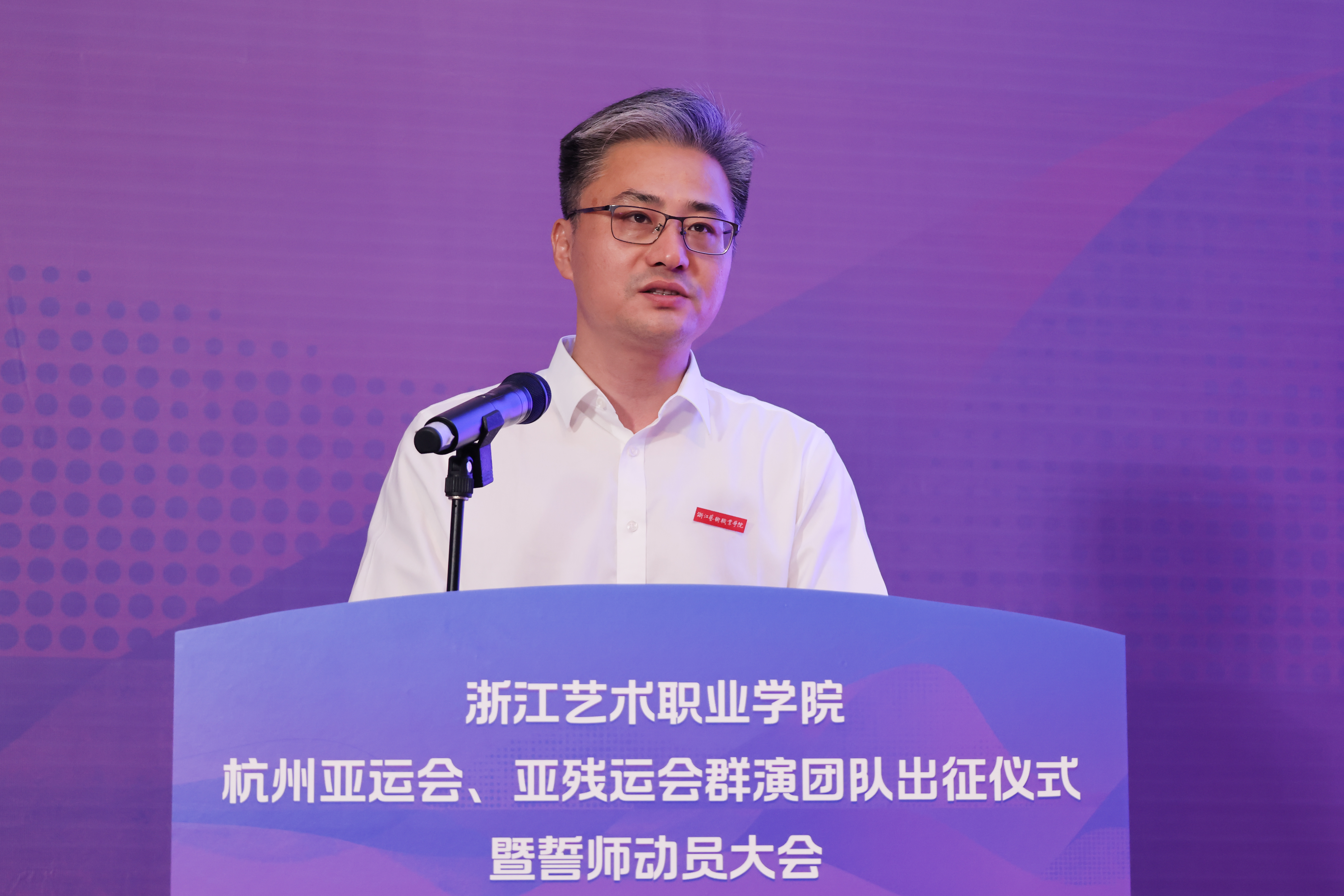 杭州亚运会开幕式总制作人、亚运会闭幕式、亚残运会开闭幕式总导演沙晓岚,杭州亚运会、亚残运会开闭幕式指挥中心仪式演出专班负责人孙俊明,杭州亚运会、亚残运会开闭幕式指挥中心仪式演出专班群演保障组主任沈晓峰,亚运会开幕式制作人、亚运会闭幕式、亚残运会开闭幕式总制作人吴艳,校领导薛亮、施俊天、夏开堂、沈军甫、支涛出席誓师大会。誓师大会由校党委副书记夏开堂主持。