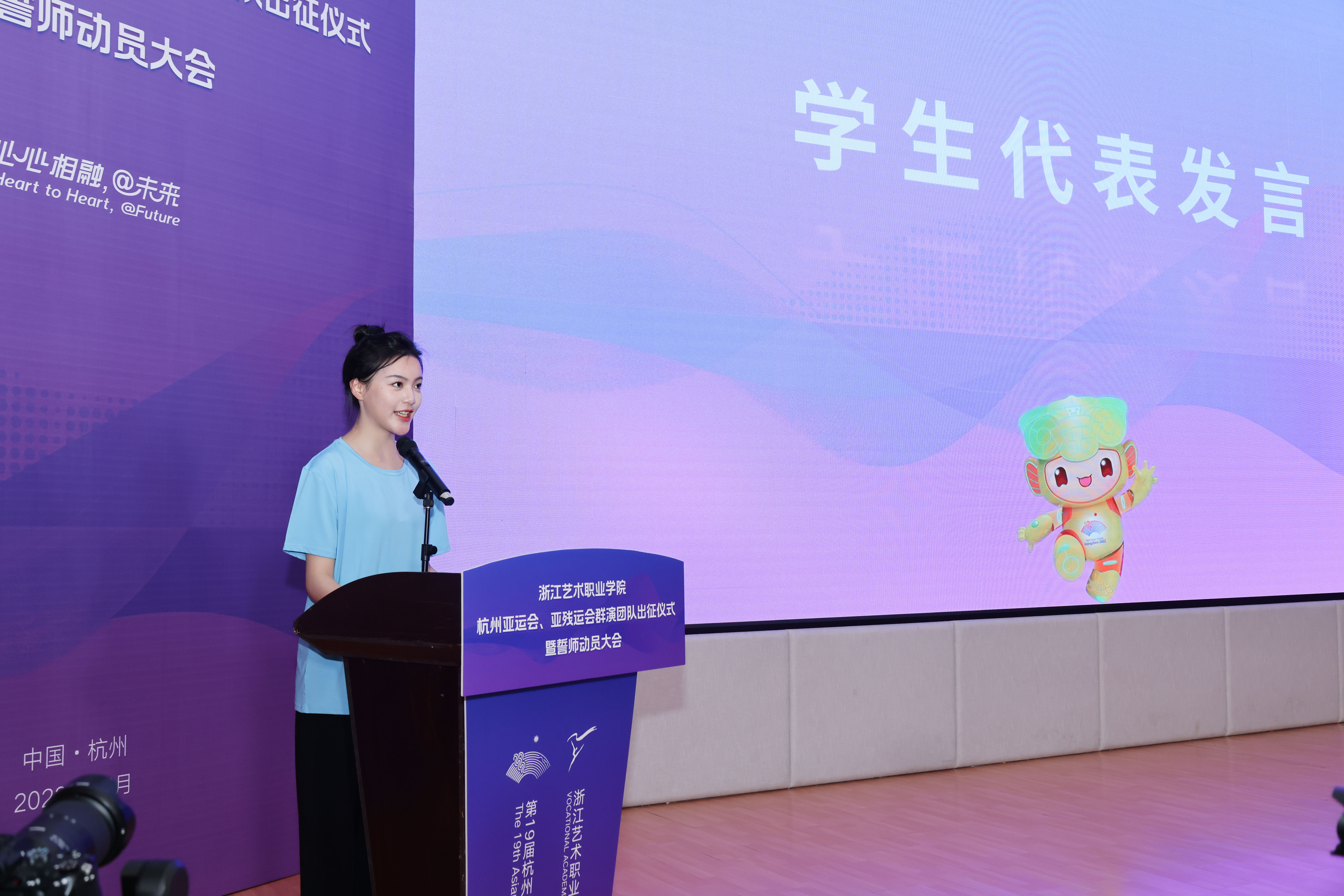 全体亚运会群演誓师宣誓:服务亚运,奋斗有我。助力梦想,青春闪耀。让我们以青春之力,为浙艺争光,为亚运添彩。