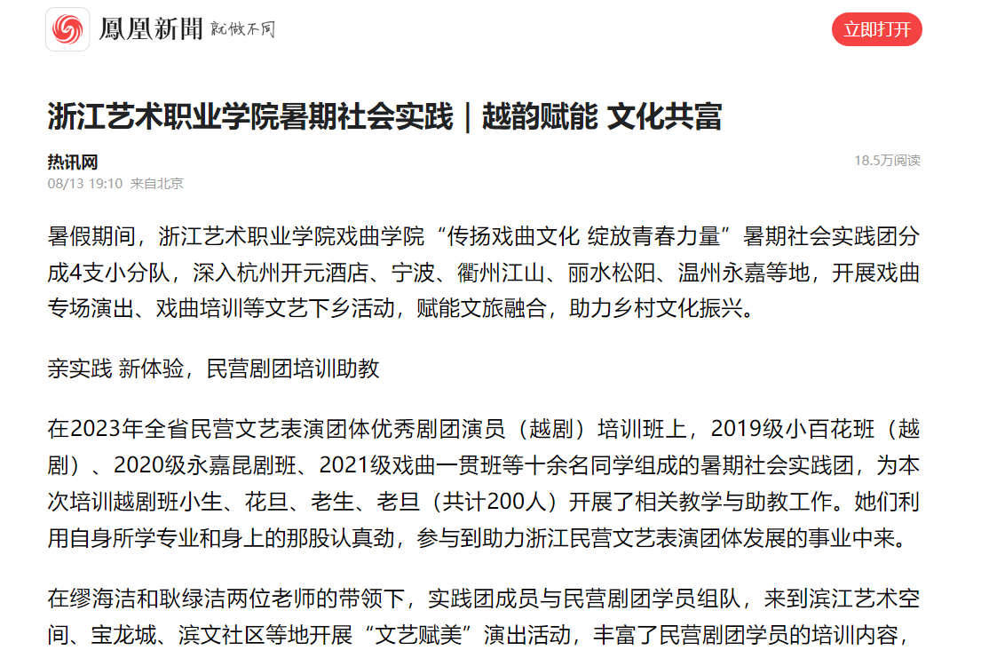 浙艺戏曲学院主动深入对接文化产业和旅游产业头部企业,加强联动合作,与开元名都大酒店联合举办越剧驻场演出,不仅为酒店打造江南特色主题风格增色,借此平台也提升了学生社会实践能力。