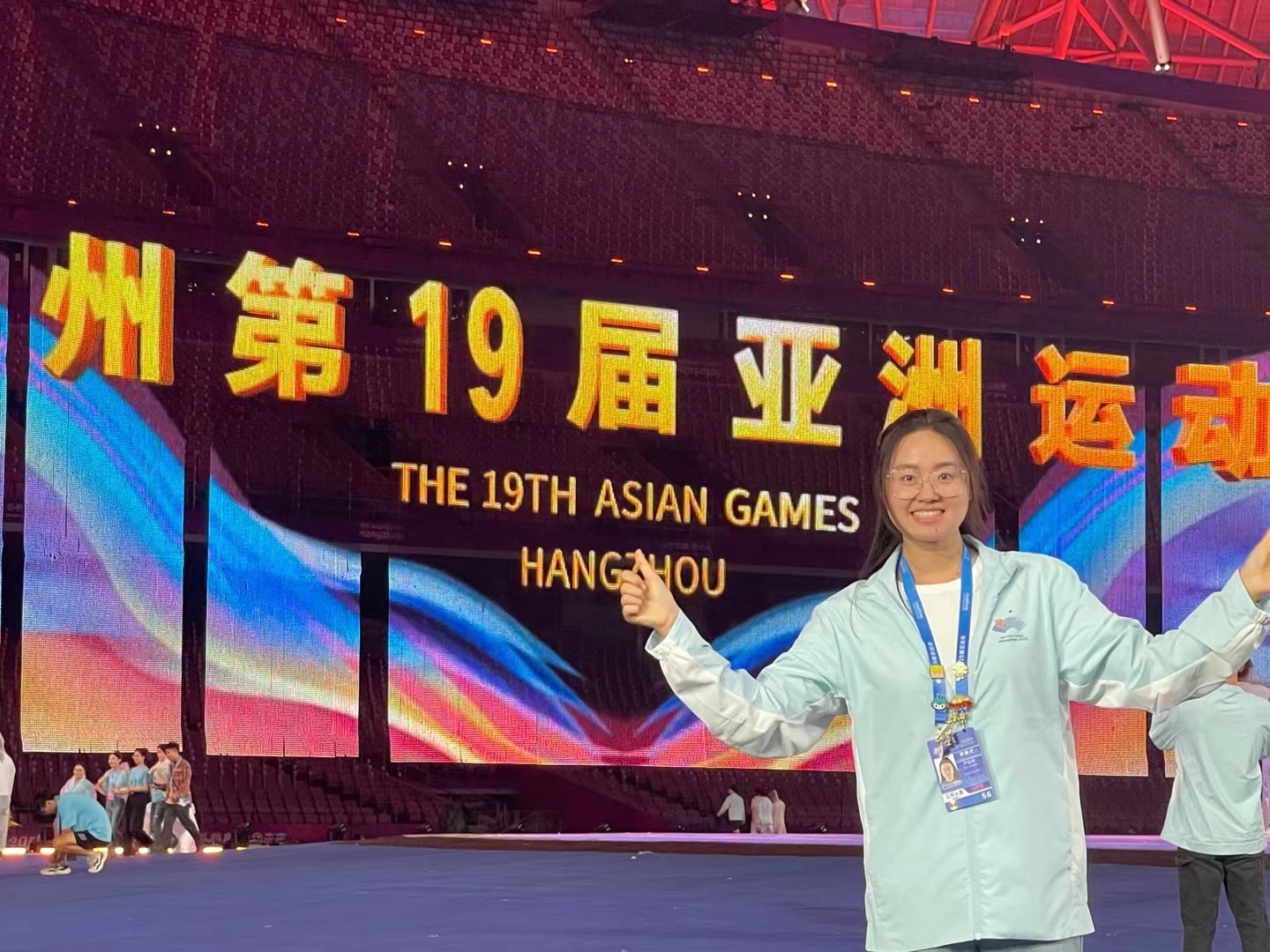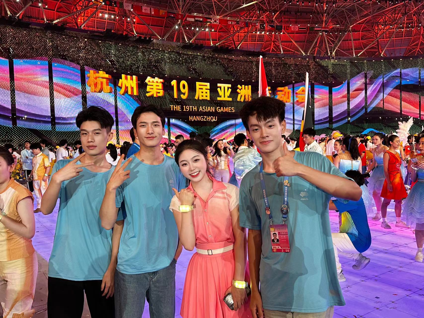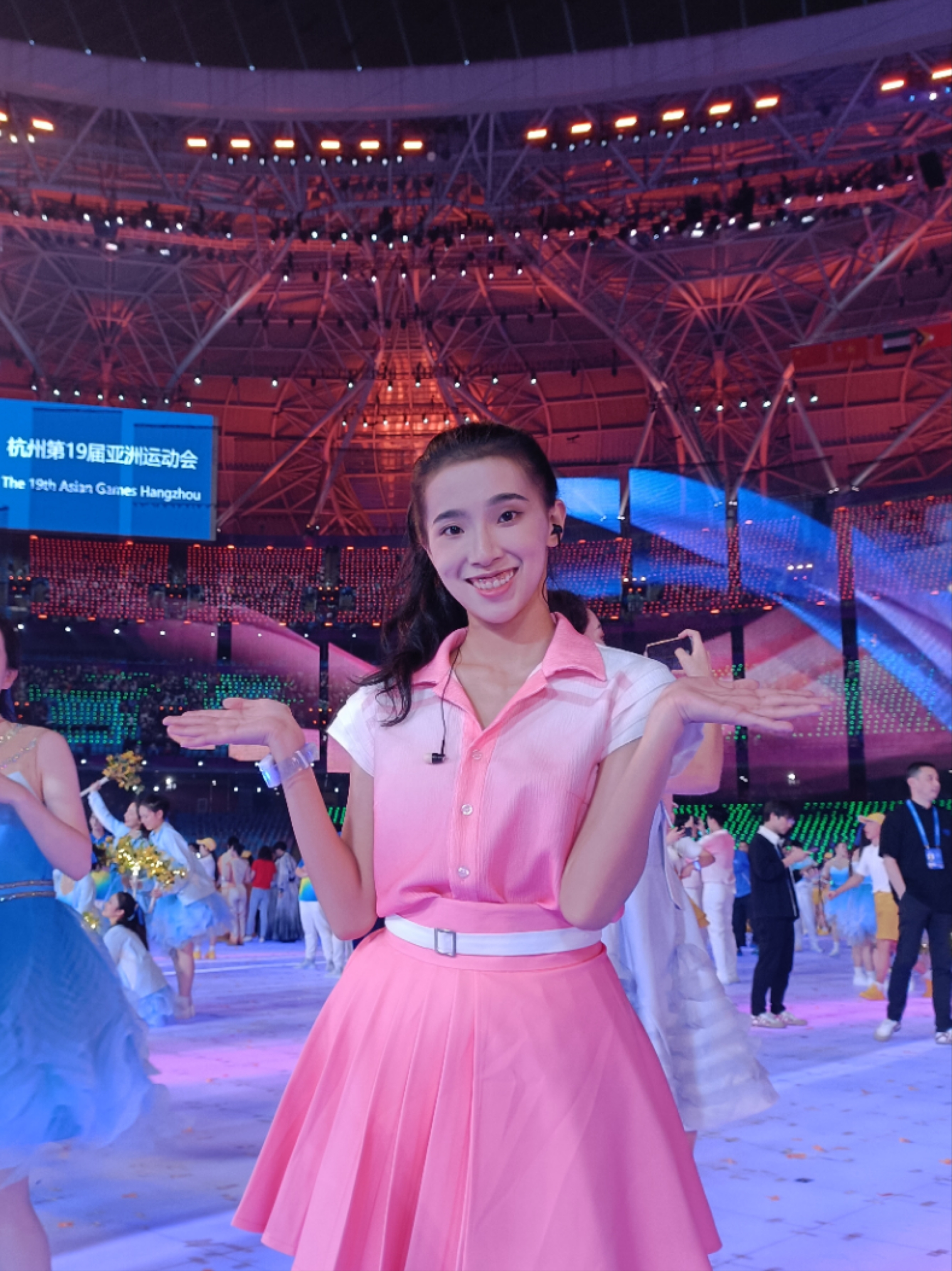 “非常幸运参加亚运开幕式演出,站在聚光灯下,听到国歌响起,当时想哭。全场一起唱主题曲的时候,到了高潮部分现场有‘桂花雨’一样的道具纸片洒落下来,心中对这段经历泛起了诸多不舍。”2021级音乐剧专业学生李如一说。
