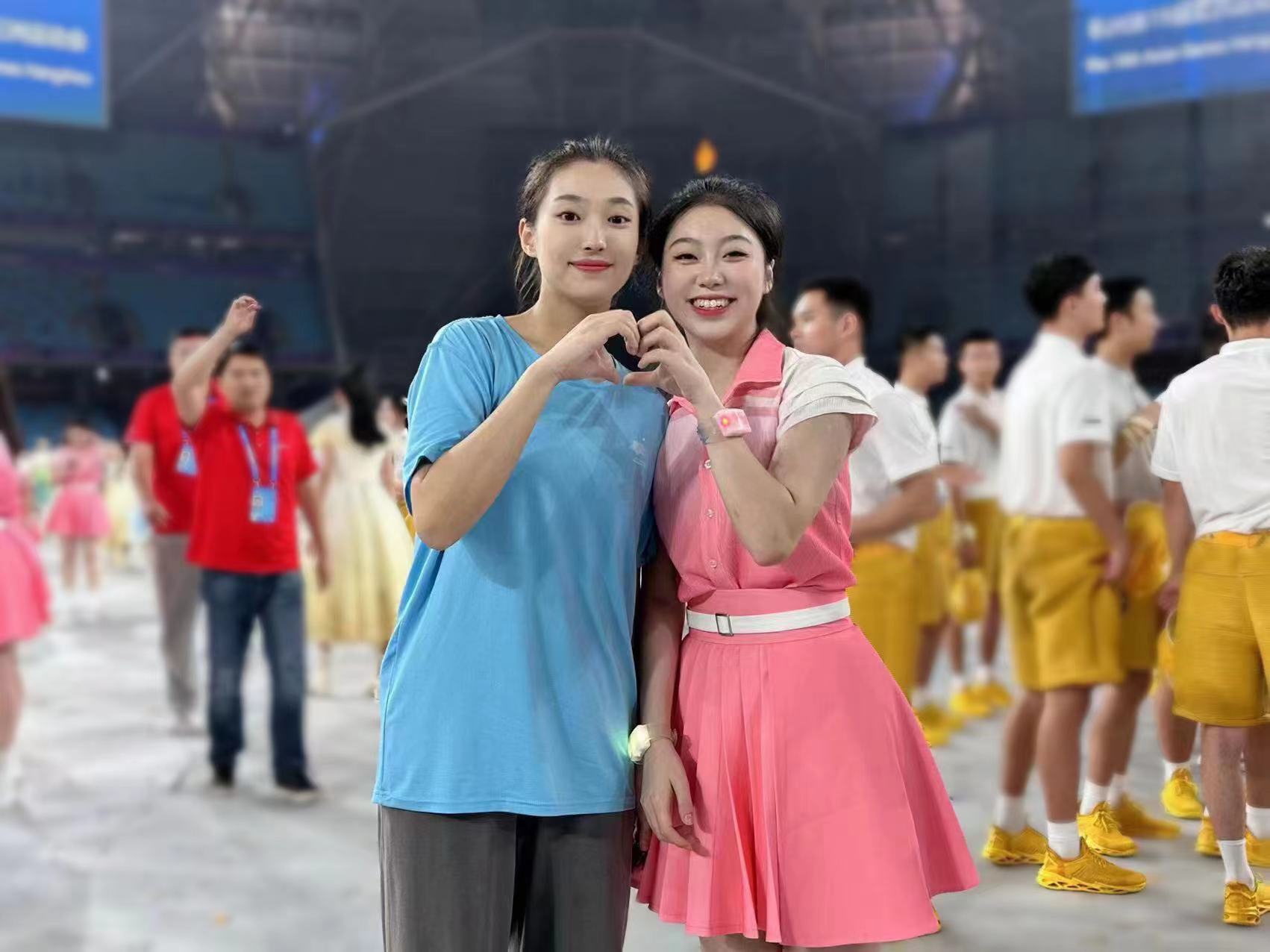 校团委的刘苏宁,也是领队老师之一,主要对接《绿水青山》和《都市丽人》节目的演员保障工作,带队工作让刘苏宁拥有了许多“第一次”:第一次送生病学生赶去医务室时的焦急、第一次看到学生演出时的兴奋、第一次看到国旗在奥体中心扬起时的热泪盈眶、第一次闻到内场桂花飘香的惊喜……开幕式结束后,看到现场热血沸腾,刘苏宁说:“在那时不禁感慨‘轻舟已过万重山’,同学们三个多月的辛苦付出,终于让全世界看到了,相信这段奋斗的日子一定会成为终生难忘的宝贵记忆。演出结束后,大家都在拍照留念,我的家人朋友也给我打来视频通话,我站在舞台中间和他们分享现场,那一刻真的觉得很感动、很荣幸。”