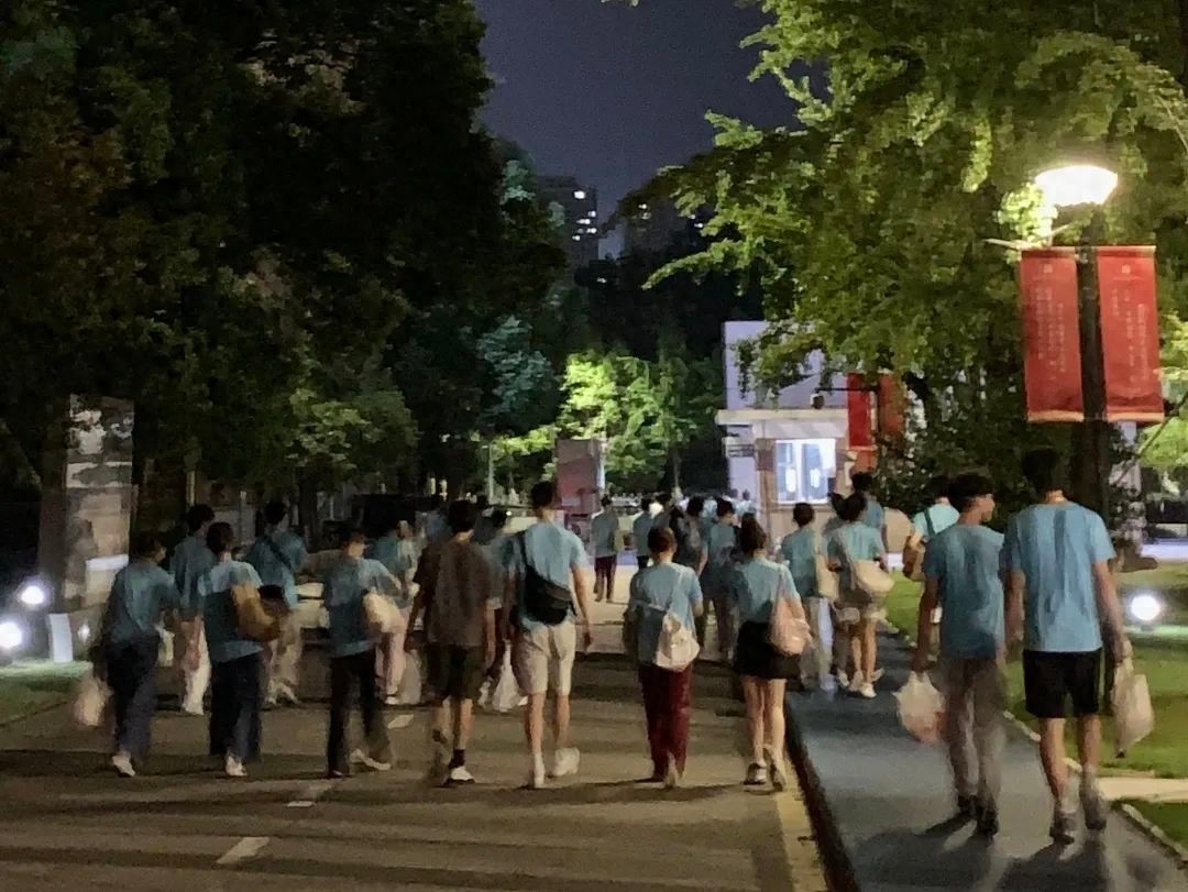 简短的动员后她们迅速进入了漫长的排练,寂静的校园在烈日的灼晒下,陪伴着她们的只有窗外蝉虫的嘶鸣声和墙上倒计时的指示屏。四五个小时的一次排练,每天重复着。进场时的烈阳高照,到离场时的夜雨白花,在潮湿闷热的空气裹挟下,子时才能拖着疲倦的身体回到寝室。几个小时的休息,更多的只是让身体有些许舒缓,脑子里却还在一遍又一遍地回忆着今天的排练过程。超负荷的日子,让她们忘却了许多,累了、痛了,想家了、落泪了……种种的思绪在这不断减少的倒计时面前都显得那么的不重要,唯有支撑的是最初的期许和逐渐产生的与这座城市同频共振的使命感。这种使命感,不仅对杭州,对浙江,甚至对中国都有着无与伦比的重要意义,而她们将是其中的亲历者。