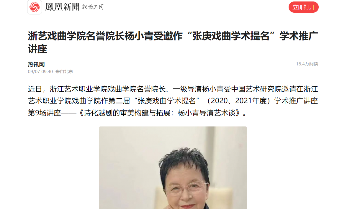 凤凰新闻:浙艺戏曲学院名誉院长杨小青受邀作“张庚戏曲学术提名”学术推广讲座