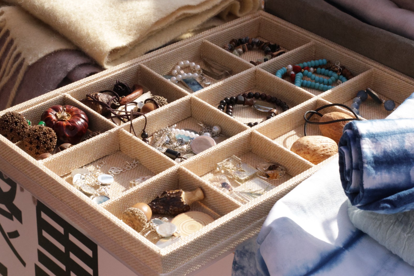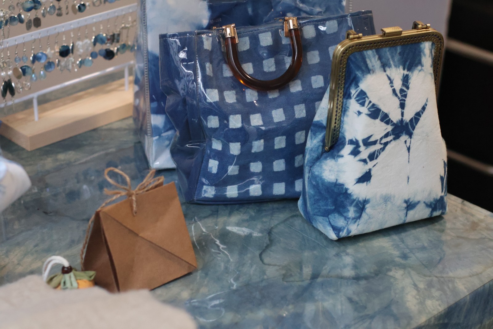 集市上,摊位热闹非凡,商品琳琅满目。手工艺学院民族传统技艺专业的师生团队紧扣课程体系,以独特的创意打造了别具特色的传统手工艺品,蓝染挂件、饰品、年历和植物染围巾被周边社区居民反复称赞。