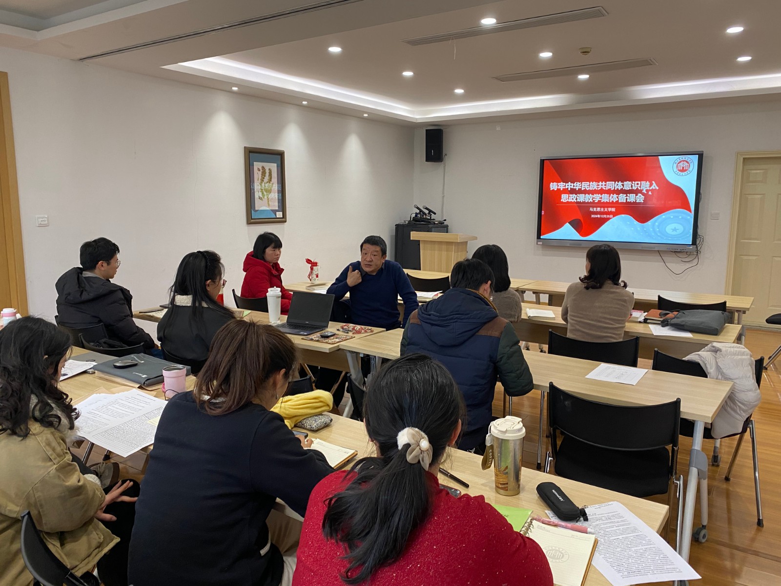为贯彻落实习近平总书记关于加强和改进民族工作的重要思想,将铸牢中华民族共同体意识融入思政课教学,促进新时代思政课改革创新,不断深化青年学生对中华民族共同体历史必然性的认识,12月25日,马克思主义学院在图信研讨室召开铸牢中华民族共同体意识融入思政课教学的集体备课会。校党委委员、宣传部部长、统战部部长傅文钢,演艺与教育学院教师蒋曼曼以及马院全体教师参加会议。