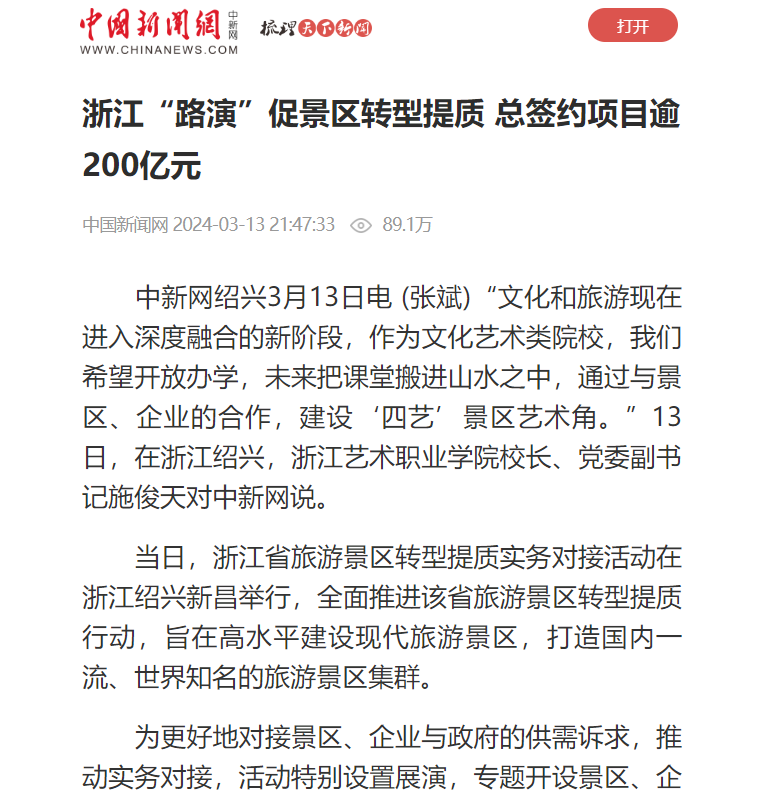 中国新闻网:浙江“路演”促景区转型提质 总签约项目逾200亿元