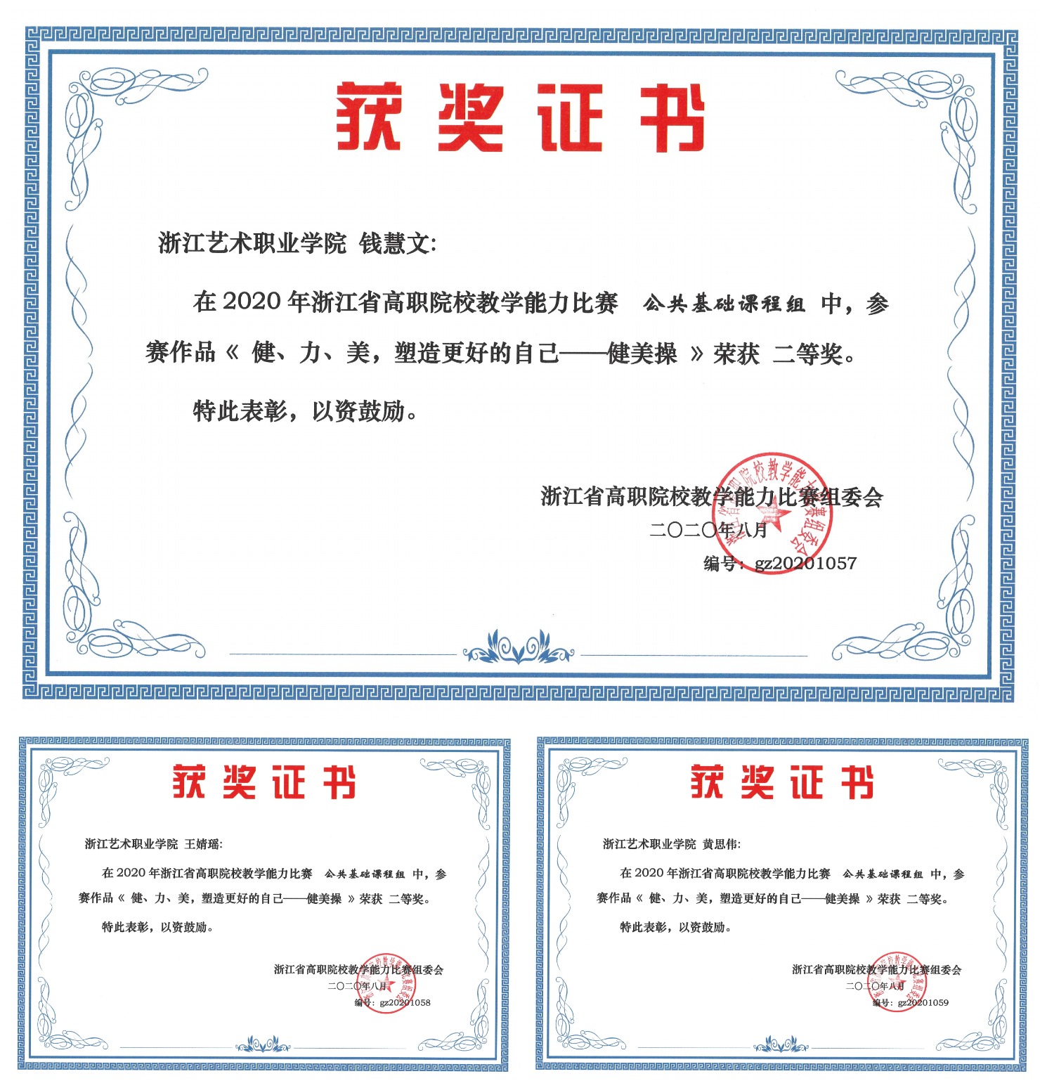 ▲《健、力、美,塑造更好的自己——健美操》荣获2020年浙江省高职院校教学能力比赛二等奖