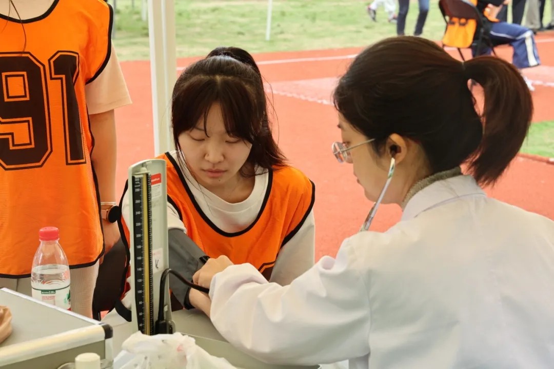为确保体测期间学生健康安全问题,学校在现场设立医疗组做好后勤保障工作。