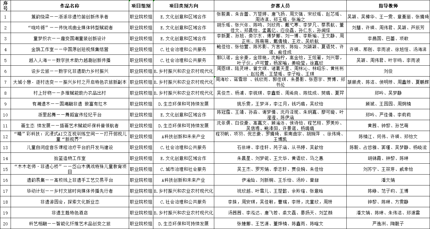 根据《关于举办浙江省第十四届“挑战杯”大学生创业计划竞赛的通知》相关规定与要求,学校于2023年12月-2024年4月开展了2024年“挑战杯”大学生创业计划竞赛参赛项目校内选拔。经校外专家组评审,拟推荐《篪韵绕梁——浙派非遗竹笛创新传承者》等20个项目参加浙江省第十四届“挑战杯”大学生创业计划竞赛。具体项目情况如下,现予公示。