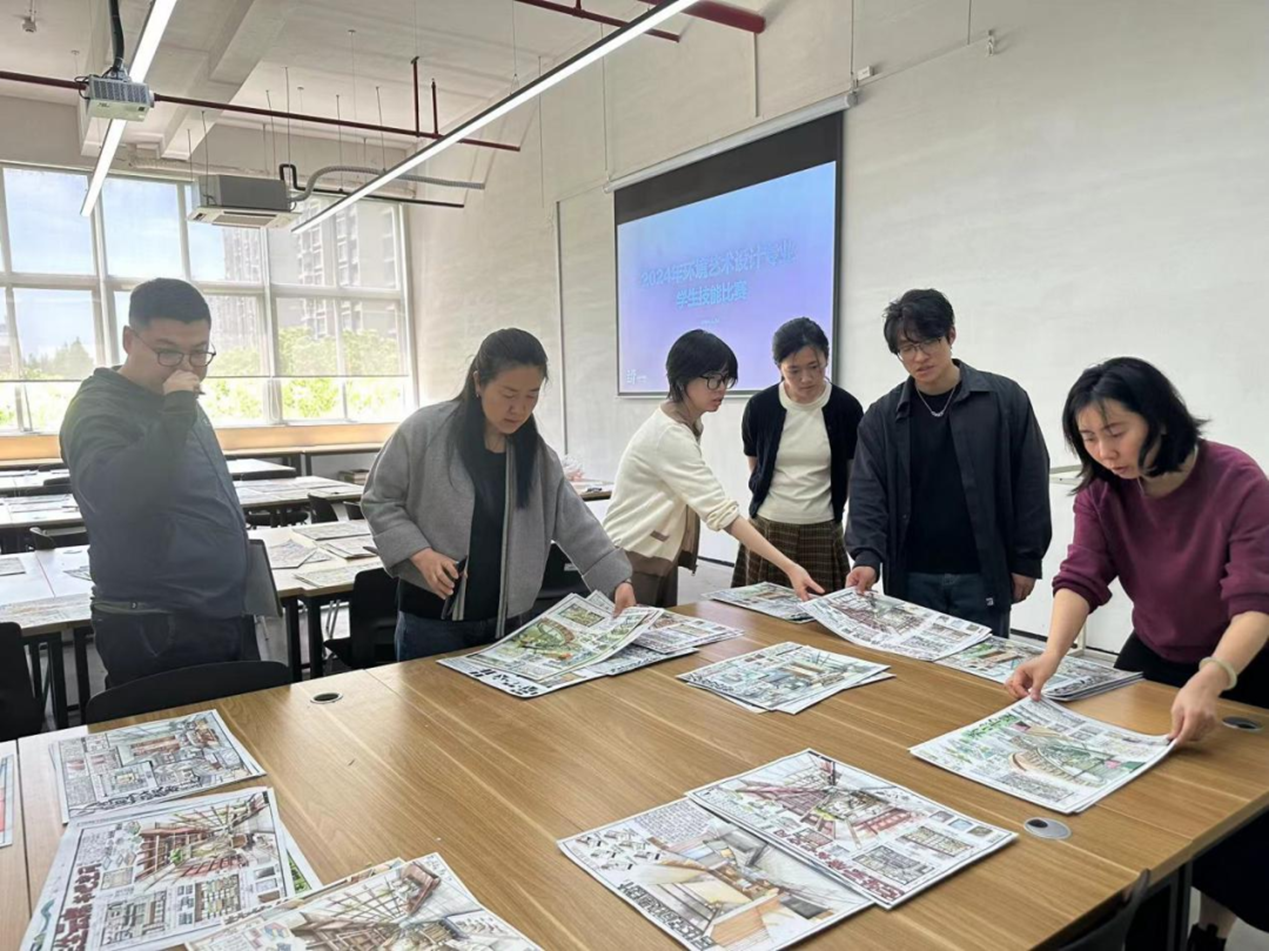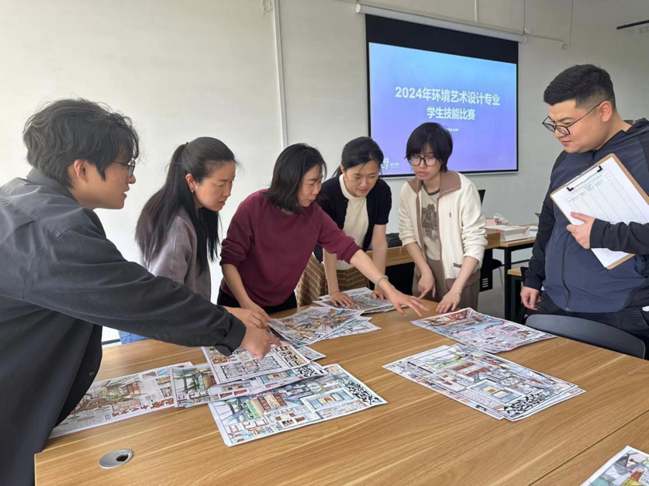 4月24日,针对此次学生专业基本功测试开展了相关作品评审工作,设计学院环境艺术设计教研室主任陶靓子及全体专业教师参加了本次评审工作。