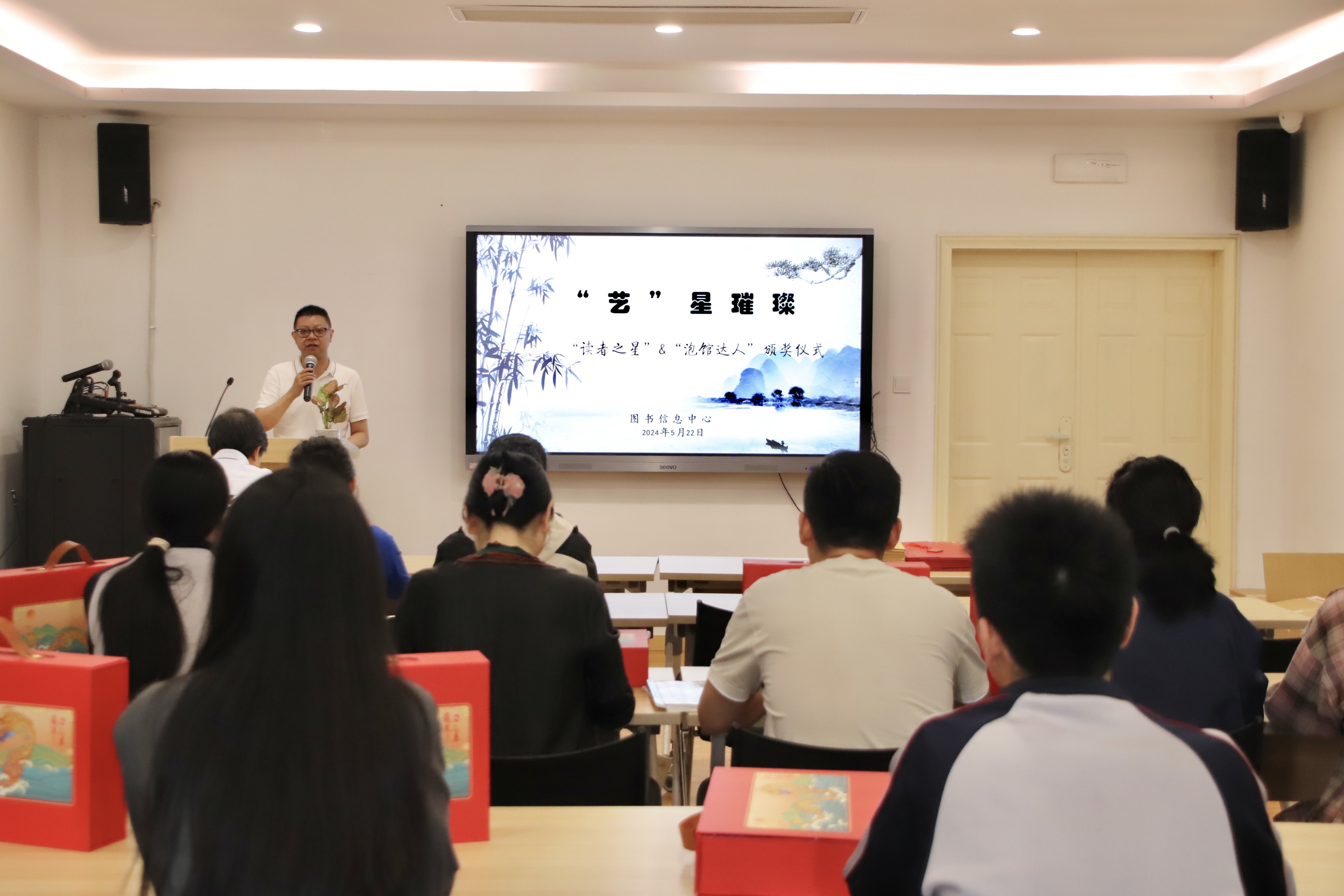 为促进书香校园建设,通过阅读陶冶情操,鼓励我校师生养成“爱读书、多读书、读好书”的习惯,营造书香浓郁的校园文化氛围,5月22日,“艺”星璀璨——2023年度“读者之星”&“泡馆达人”颁奖仪式在图书信息中心四楼研讨室举行。我校副校长徐芳、图书信息中心主任项骏、副主任周安与获得“读者之星”及“泡馆达人”荣誉的二十余位师生参加颁奖典礼,师生齐聚一堂,其乐融融。