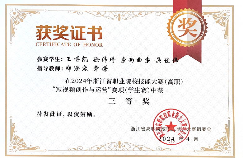 为认真落实习近平总书记有关职业教育的重要论述,全面建设社会主义现代化国家、实现中华民族伟大复兴的中国梦提供有力人才和技能支撑,2024年浙江省职业院校技能大赛(高职组)暨全国职业院校技能大赛浙江赛区选拔赛“短视频制作与运营”赛项于4月2日在湖州职业技术学院开赛。来自全省43所高等职业院校、2所职业大学的88支参赛队伍,共351名选手参加了本次竞赛。戏剧影视学院师生团队荣获三等奖。