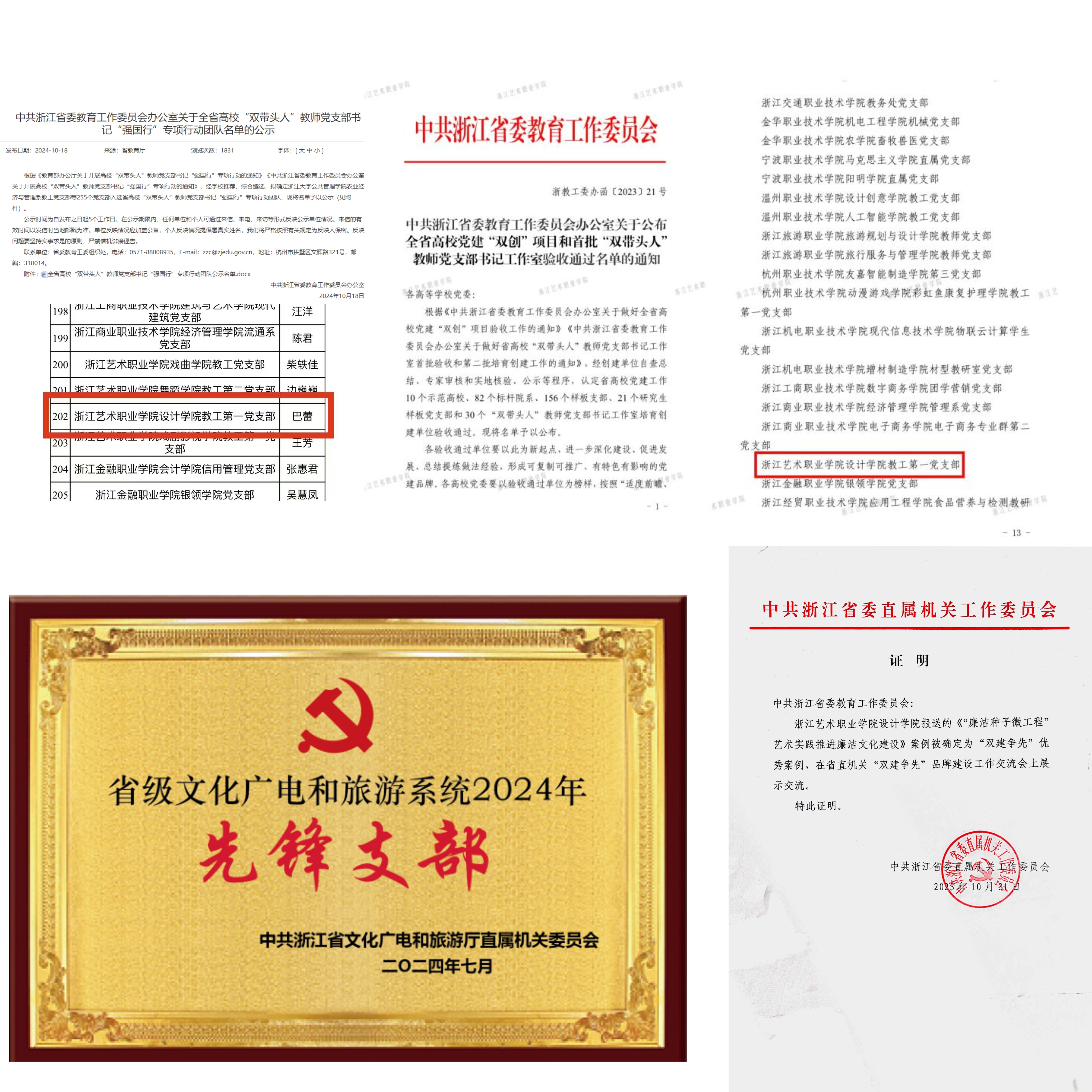 学院是学校首批党总支领导下的院长负责制试点单位。通过推行“五学联动”运行机制,形成以“七彩先锋”党建品牌为牵引,以“样板打造样板”为抓手,助推“双带头人”工作室培育。创新“红色寻访”实践教育活动,连续举办五季“设计清风”廉洁讲堂,承办“艺心向党 礼赞百年”——庆祝中国共产党成立100周年等多场展览。获评省级党建工作样板支部1个,省文化广电和旅游系统先锋支部1个,省委直属机关“双建争先”优秀案例1个,入围省级“双带头人”教师党支部书记“强国行”专项行动1项,并多次获评校级“先进基层党组织”,入选学校首批“勤廉小单元”示范点。