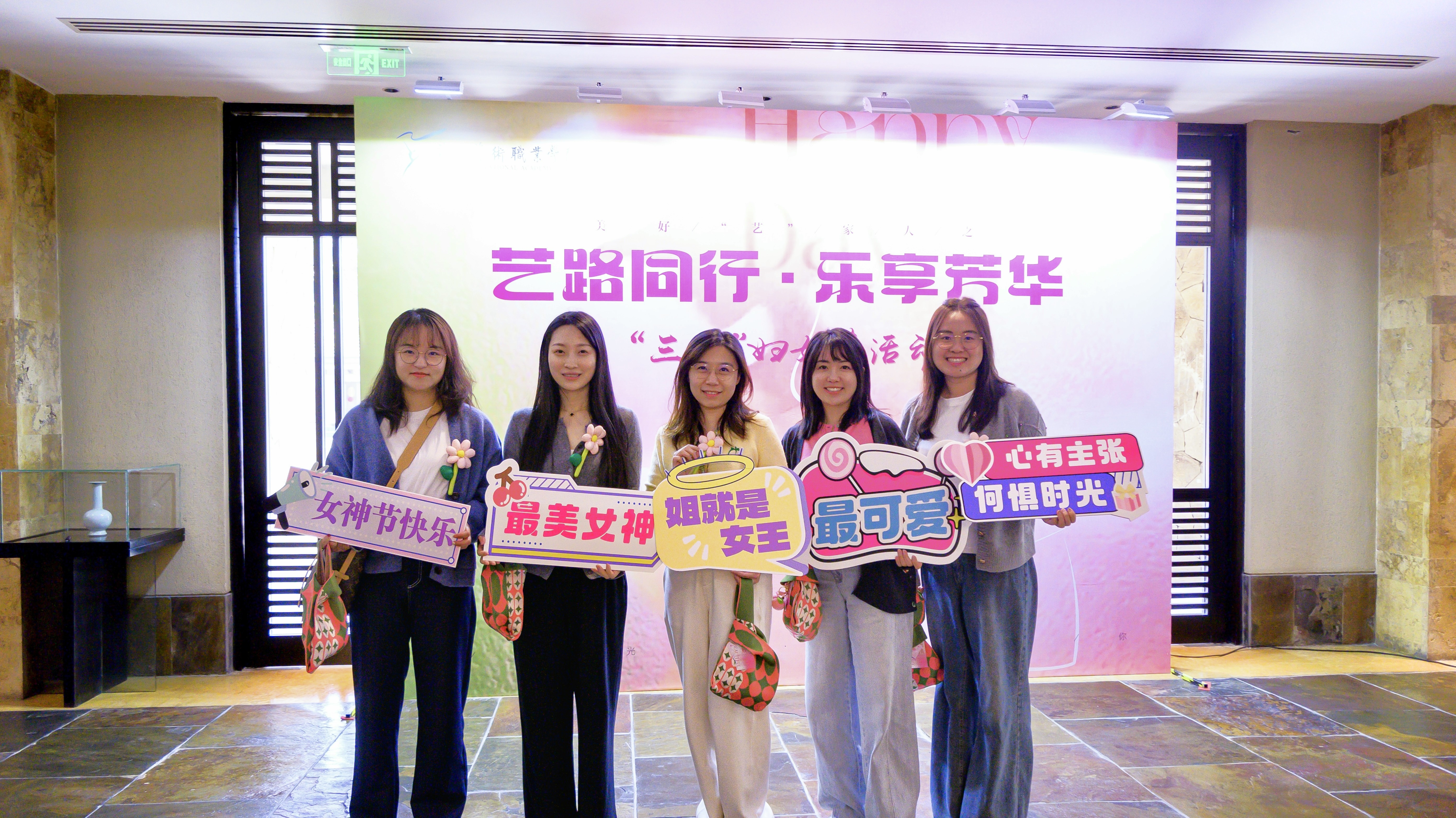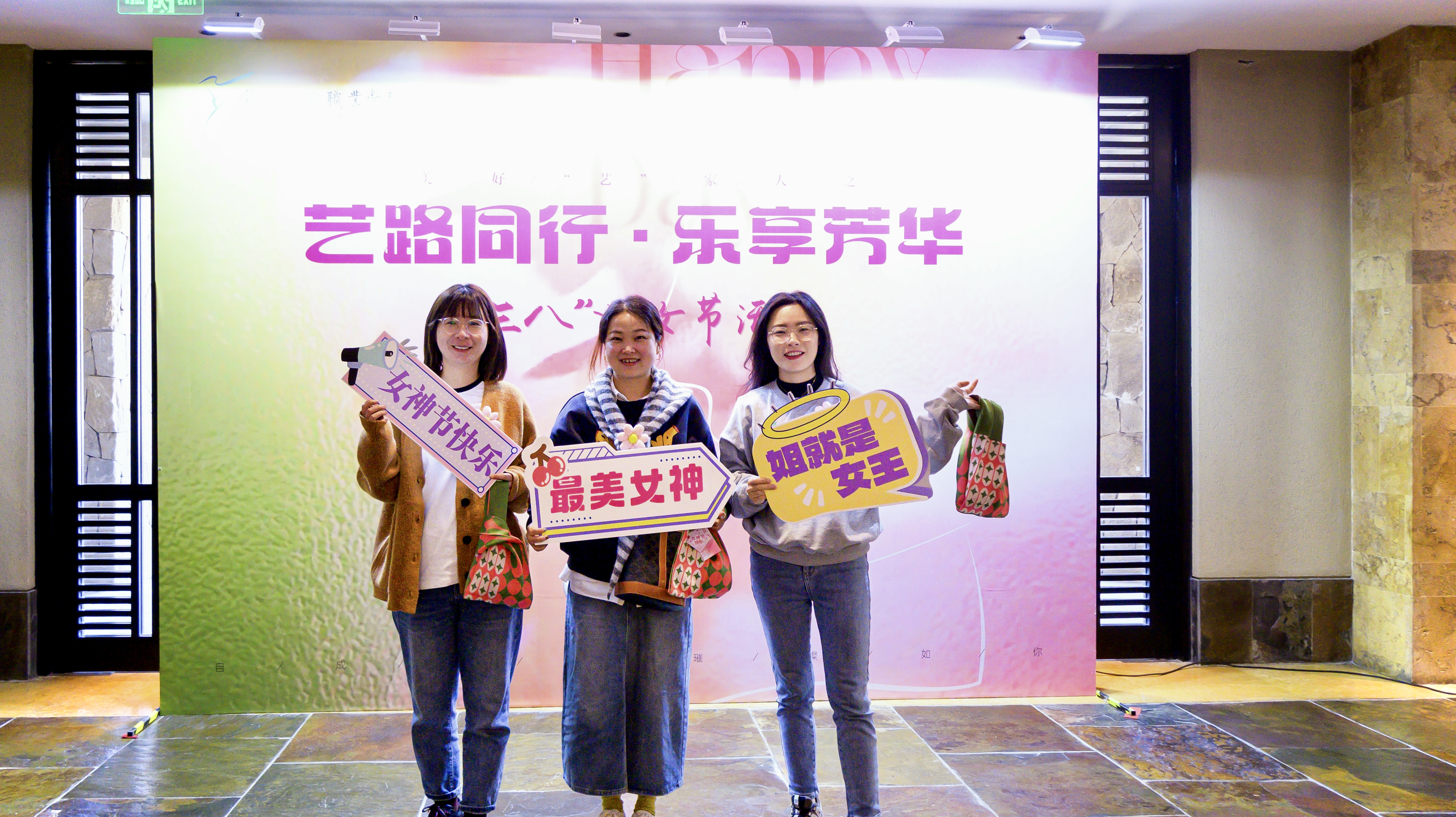 活动现场,从签到台的背景布置,到伴手礼的精心选配,从满面春光的合影留念,到踏春之行的圆满成功,每一个细节都彰显着对女教职工的衷心祝福。既有美好“艺”家人的团队理念,“艺路同行·乐享芳华”的衷心祝愿,“自成光芒·璀璨如你”的诚挚期盼,“女神节快乐”“集美貌与智慧并存”等标语,与充满少女心的蜜桃粉茶具伴手礼搭配,共同织就节日的温暖图景。