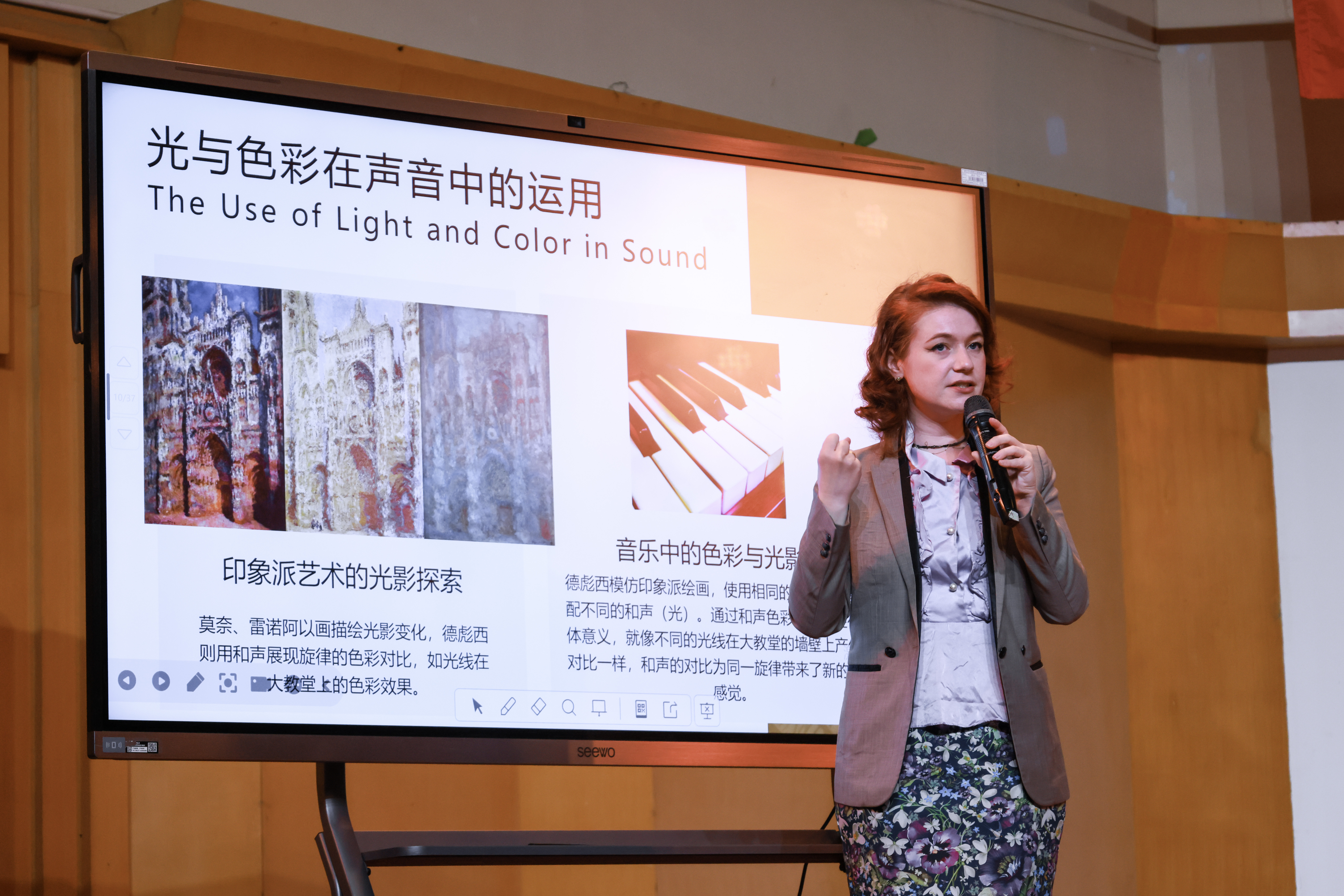 德彪西音乐研讨会上,Louise Cournarie博士以《视觉艺术与法国特质对德彪西音乐的影响》为题,通过多媒体展示与现场演奏相结合的方式,带领听众走进印象派音乐的美学世界。她巧妙地将莫奈画作的光影变幻、东方艺术的线条韵律与德彪西的《月光》《幻想曲》等经典作品进行跨时空对话,生动诠释了"音画交融"的艺术真谛。在场学生感叹:"这不仅是音乐课,更是一场美学的启蒙。"