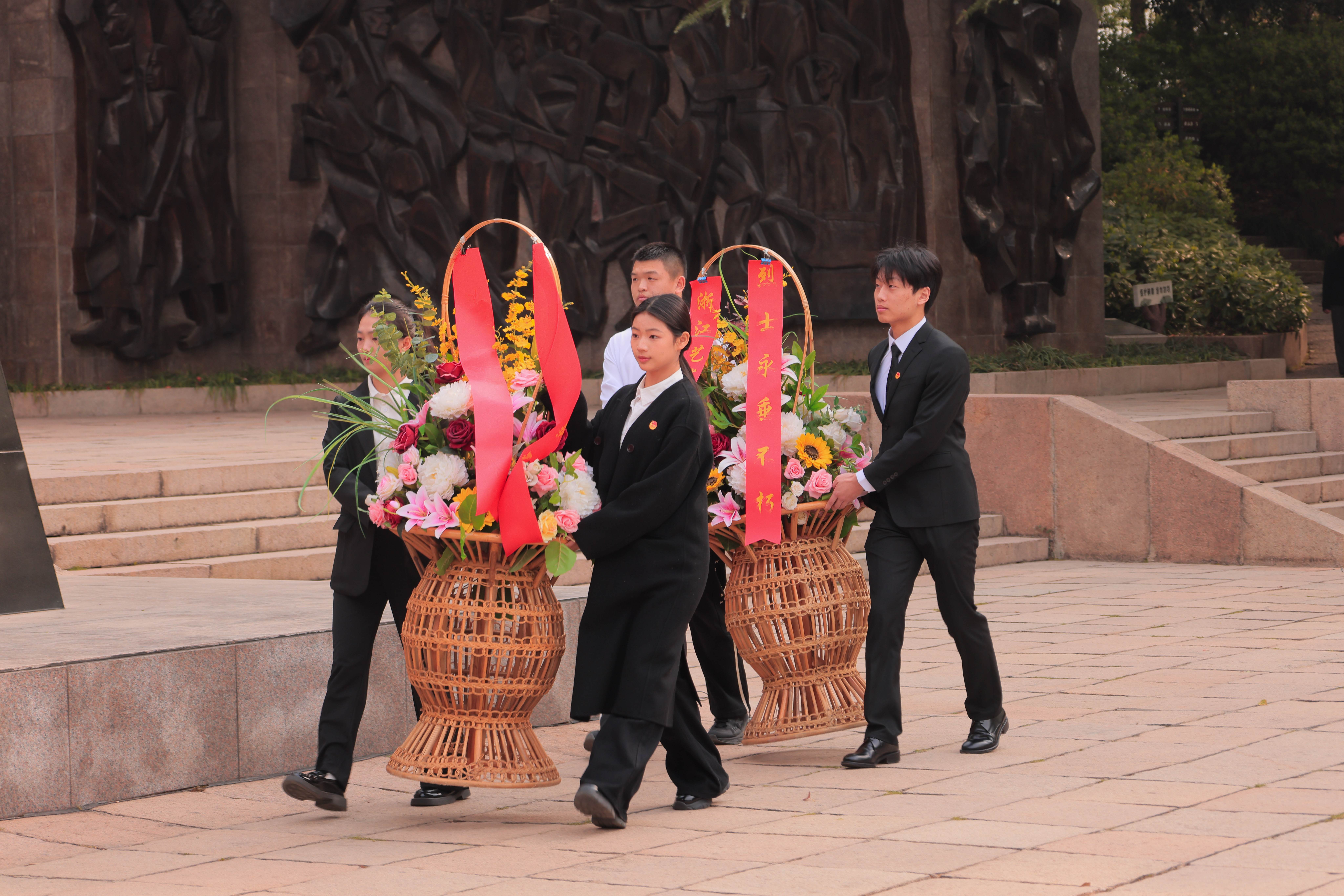清晨的阳光洒在浙江革命烈士纪念馆前,广场上的气氛庄严肃穆。我校师生代表整齐列队,怀着无比崇敬的心情,庄重举行烈士公祭仪式。随着《献花曲》悠扬的旋律缓缓响起,学生代表步伐坚定地走向烈士纪念碑前,将满载敬意与哀思的花篮缓缓敬献。党委书记薛亮与校长施俊天神情庄重地整理着花篮上的挽联,每一个动作都透露出对革命先烈的无限敬仰。全体人员肃立,向革命烈士行三鞠躬礼,每一次鞠躬都是对革命先烈们英勇事迹的深刻缅怀,更是对他们无私奉献精神的崇高致敬。