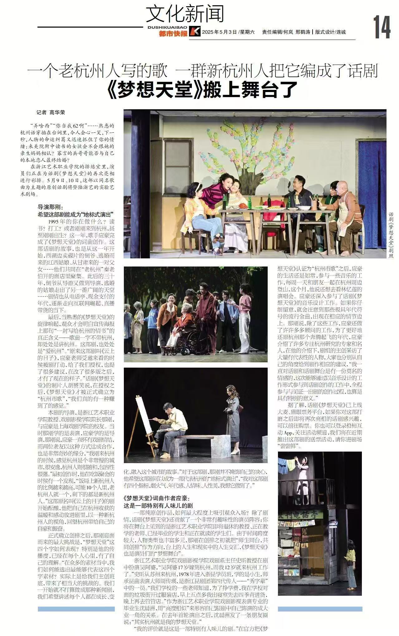 最后,当熟悉的《梦想天堂》的旋律响起,观众才会明白宣传海报上那句“一封写给杭州的情书”的真正含义——歌曲一字不带杭州,却处处是讲杭州。这部剧,也处处是“爱杭州”。“原来这部剧叫《云上的日子》,应豪老师受邀来看的时候被剧打动,给了我们授权,也提了很多建议,在改了很多版之后,才有了现在的样子。”话剧《梦想天堂》的制片人胡赟笑说,在授权之后,《梦想天堂》才被正式确立为“杭州市歌”,“我们真的有一种赚到了的感觉。”